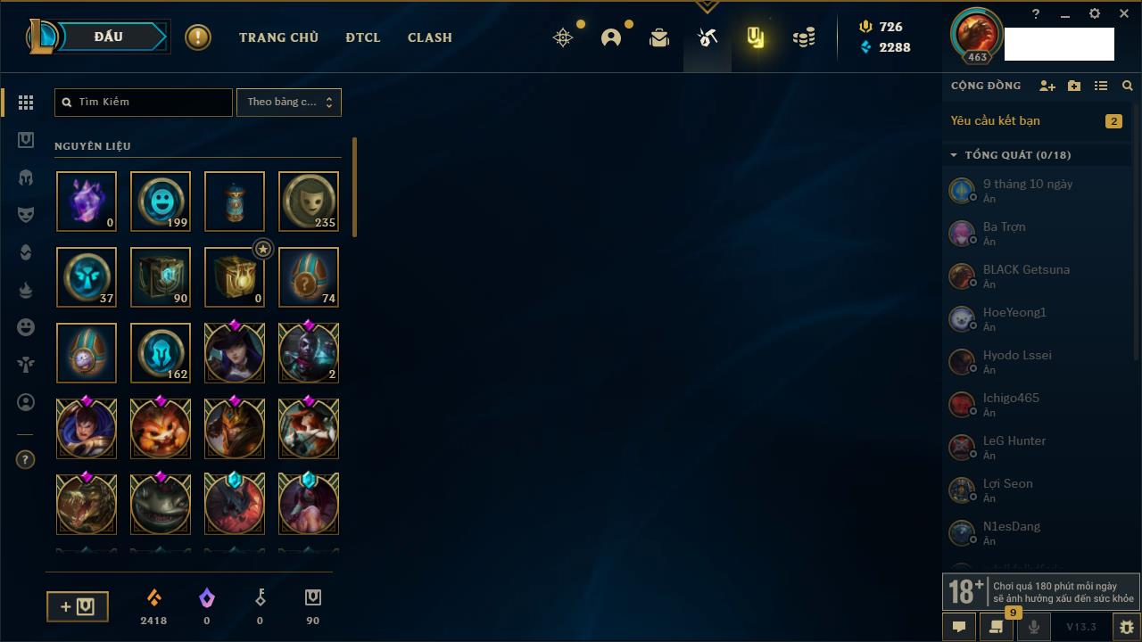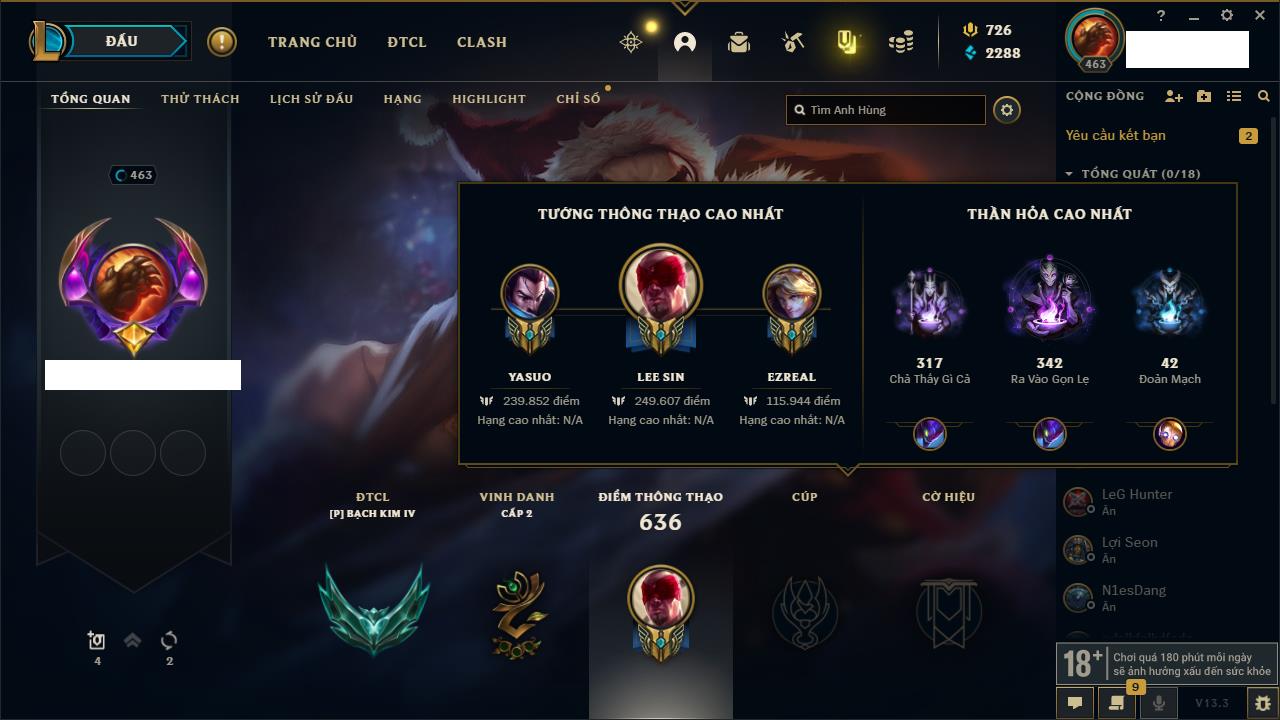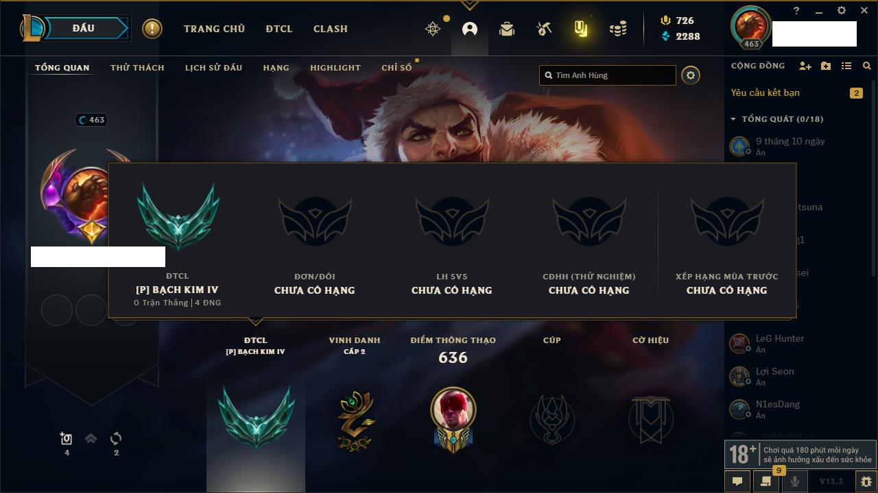 Rank Đơn: Bạch Kim IIIKhung: Bạch kimTướng: 171 - Còn 251383 THXTrang Phục: 229Rank ĐTCL: Sắt IILinh Thú: 51