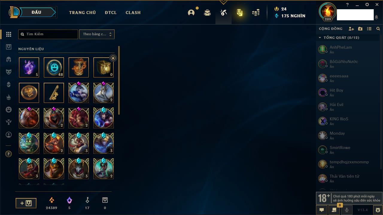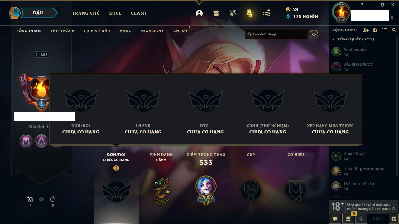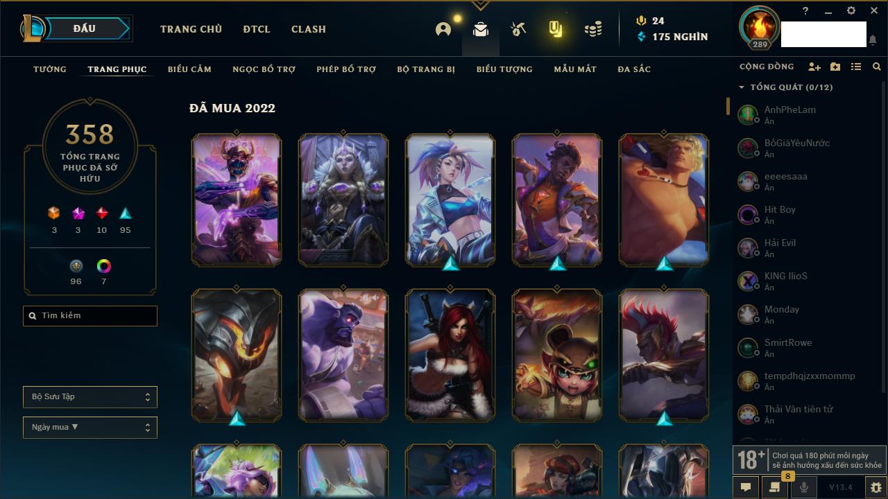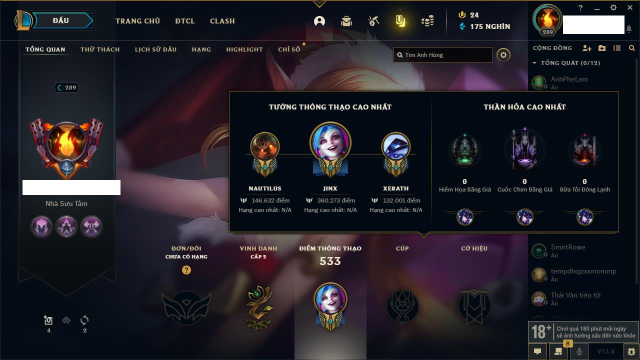 Rank Đơn: Vàng IKhung: Bạch kimTướng: 170 - Còn 212450 THXTrang Phục: 214Rank ĐTCL: Bạch Kim IVLinh Thú: 221