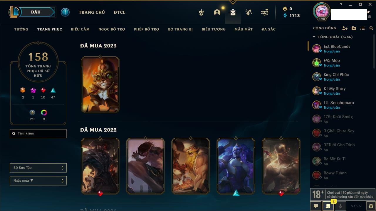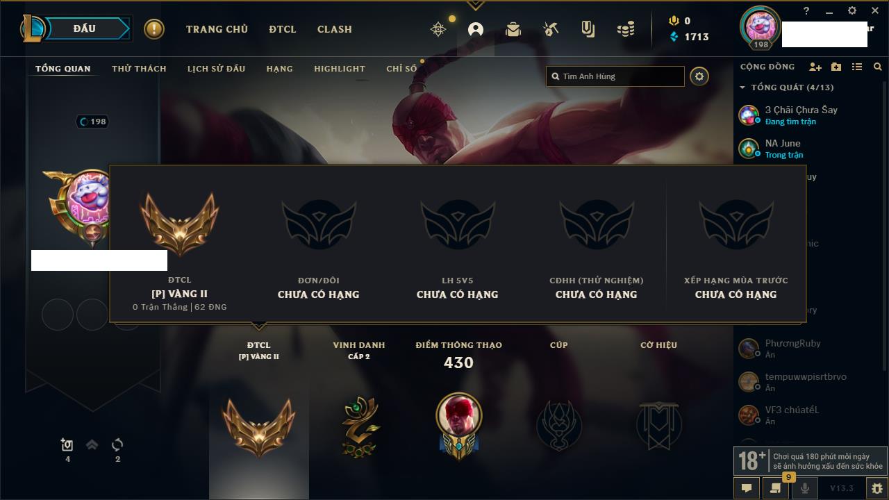 Rank Đơn: Chưa RankKhung: Chưa có khungTướng: 162 - Còn 23234 THXTrang Phục: 150Rank ĐTCL: Chưa RankLinh Thú: 42