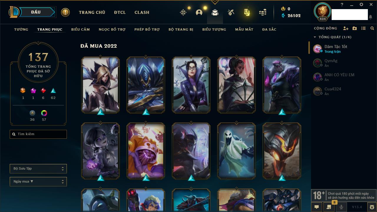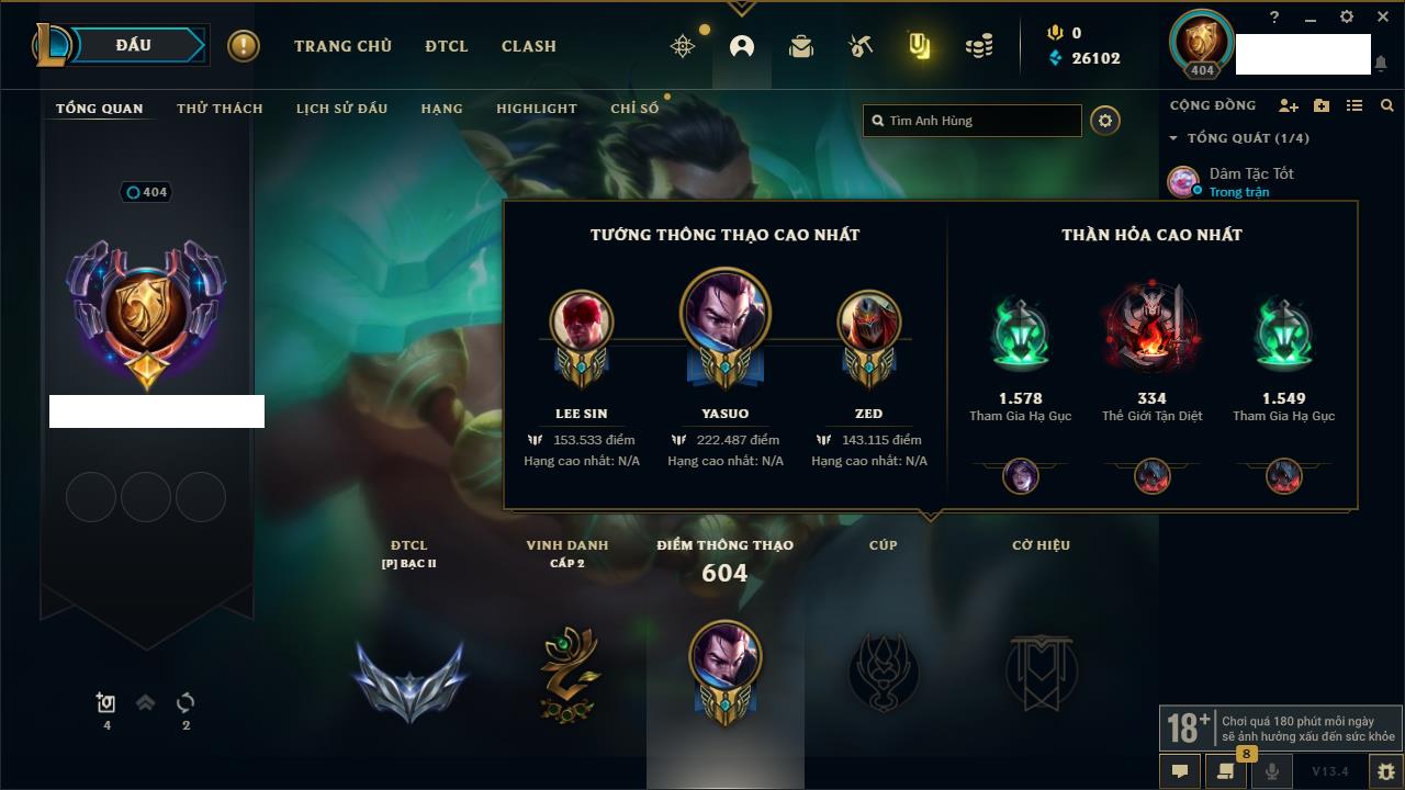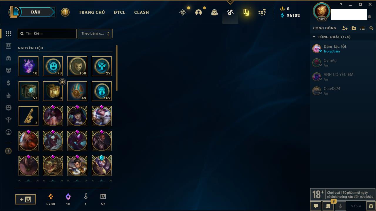 Rank Đơn: Vàng IVKhung: BạcTướng: 171 - Còn 426239 THXTrang Phục: 162Rank ĐTCL: Chưa RankLinh Thú: 33