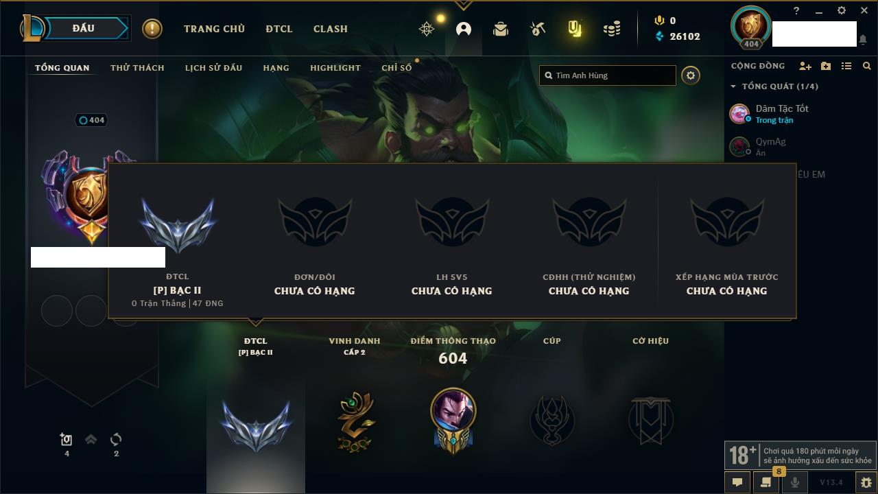 Rank Đơn: Vàng IVKhung: BạcTướng: 166 - Còn 180925 THXTrang Phục: 163Rank ĐTCL: Chưa RankLinh Thú: 67