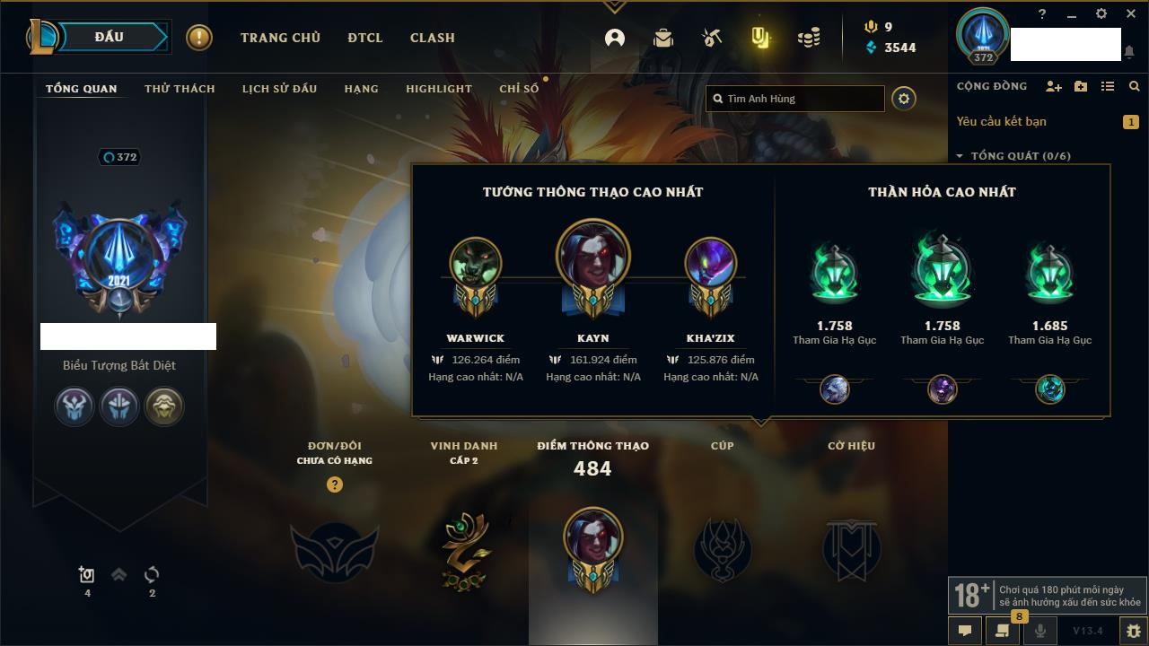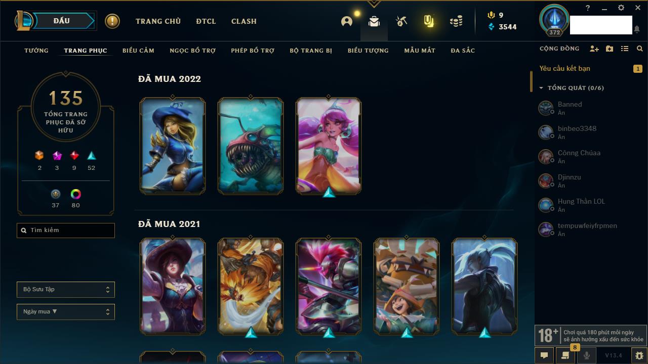 Rank Đơn: Bạch Kim IVKhung: Bạch kimTướng: 171 - Còn 218930 THXTrang Phục: 162Rank ĐTCL: Chưa RankLinh Thú: 118