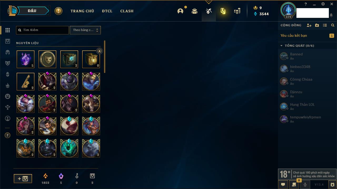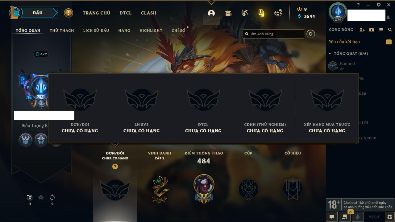 Rank Đơn: Bạch Kim IIIKhung: Bạch kimTướng: 171 - Còn 210697 THXTrang Phục: 220Rank ĐTCL: Bạc IVLinh Thú: 51