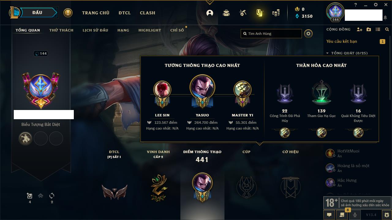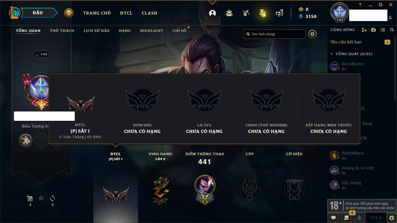 Rank Đơn: Vàng IKhung: BạcTướng: 171 - Còn 60584 THXTrang Phục: 286Rank ĐTCL: Vàng IIILinh Thú: 117