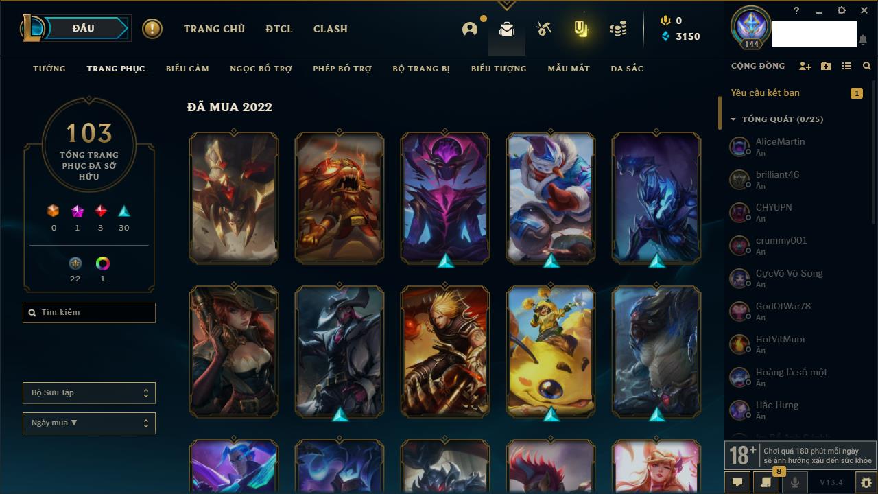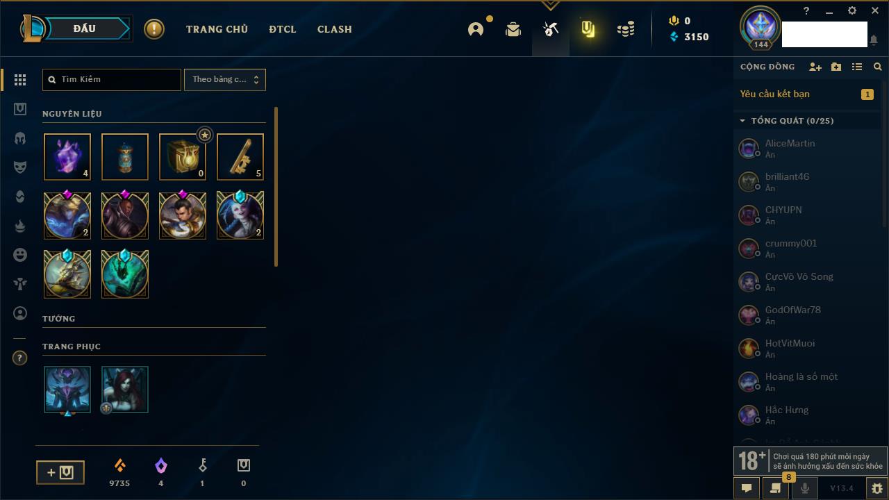 Rank Đơn: Vàng IIIKhung: VàngTướng: 171 - Còn 88128 THXTrang Phục: 329Rank ĐTCL: Chưa RankLinh Thú: 41