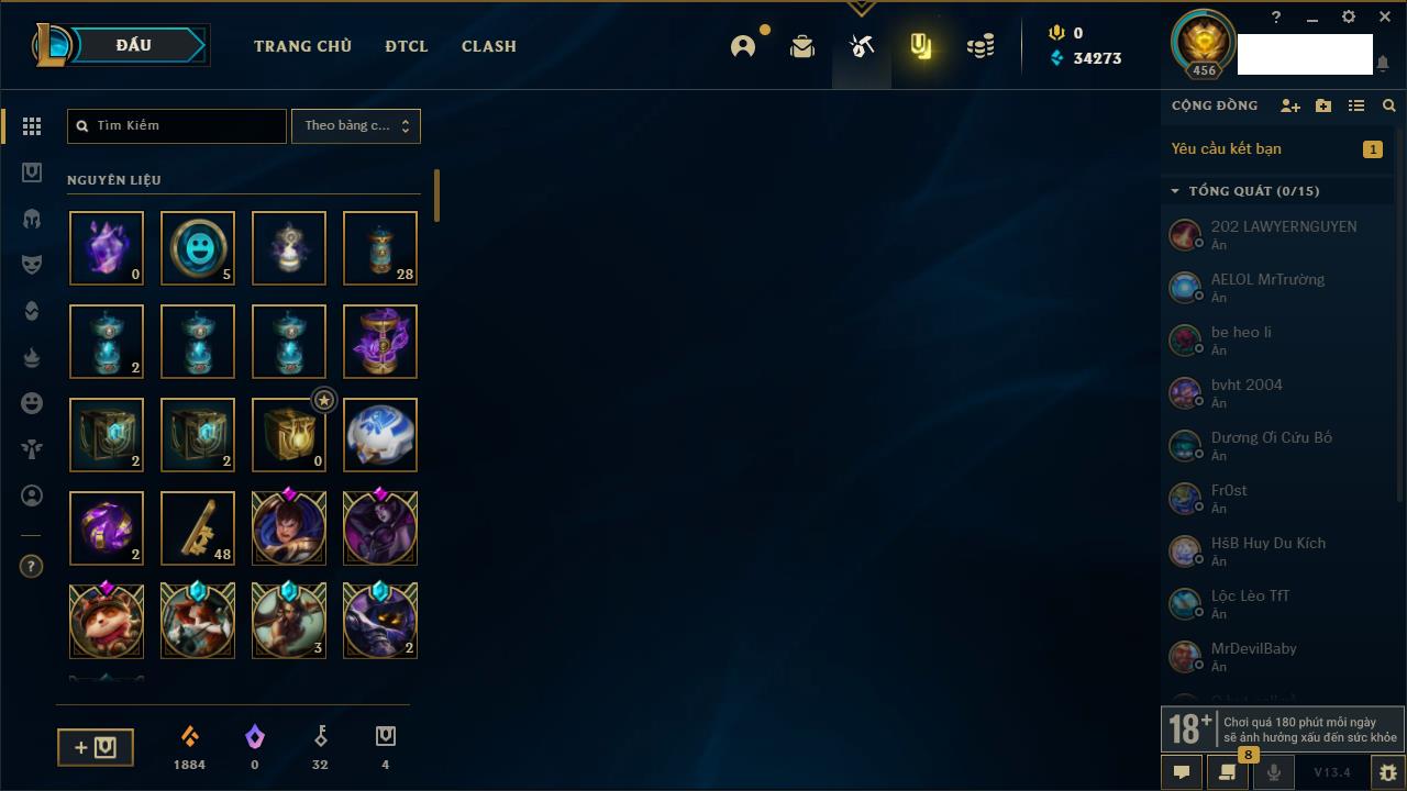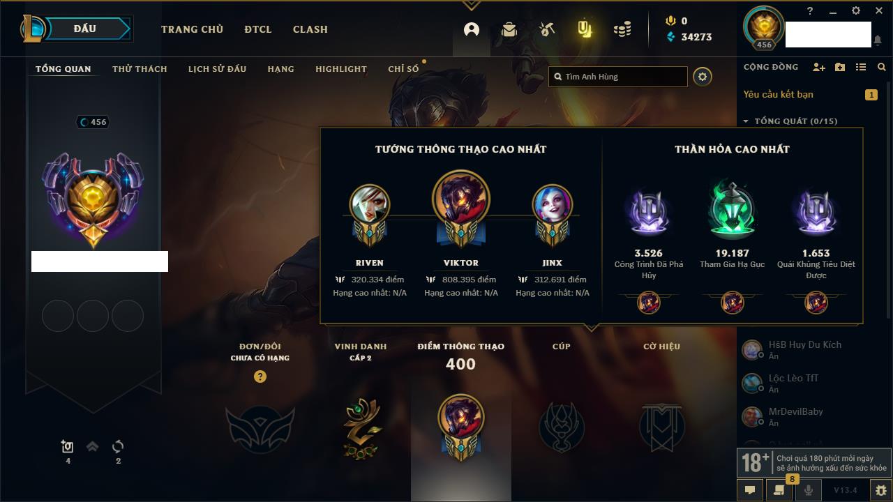 Rank Đơn: Vàng IVKhung: VàngTướng: 171 - Còn 48721 THXTrang Phục: 171Rank ĐTCL: Chưa RankLinh Thú: 27