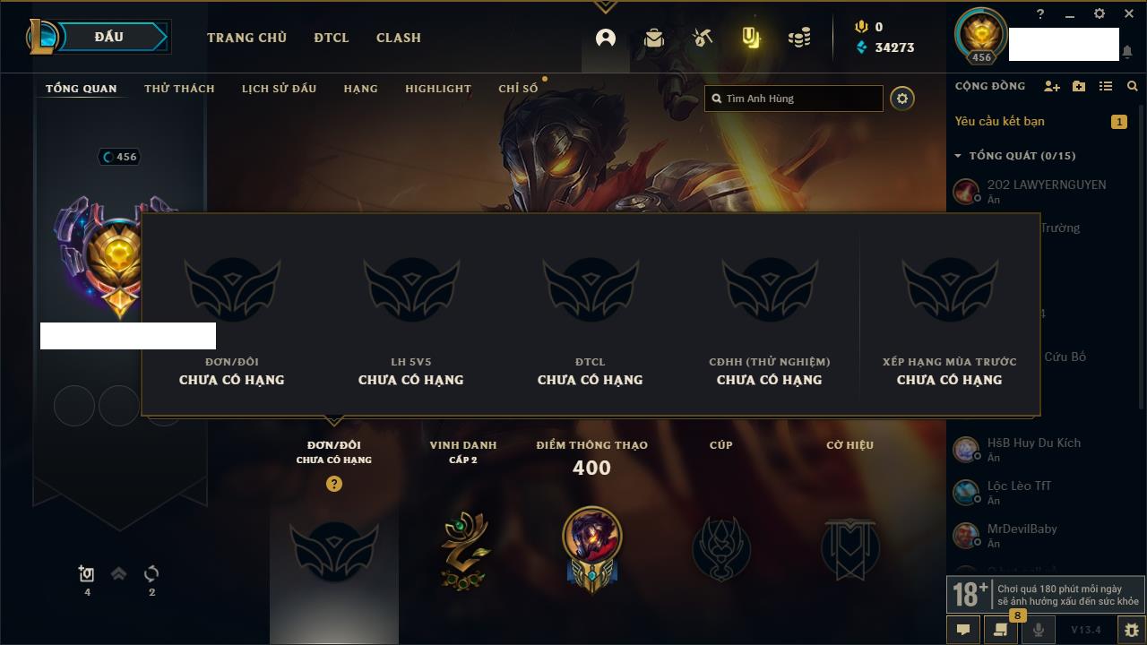 Rank Đơn: Vàng IVKhung: BạcTướng: 171 - Còn 426239 THXTrang Phục: 162Rank ĐTCL: Chưa RankLinh Thú: 33