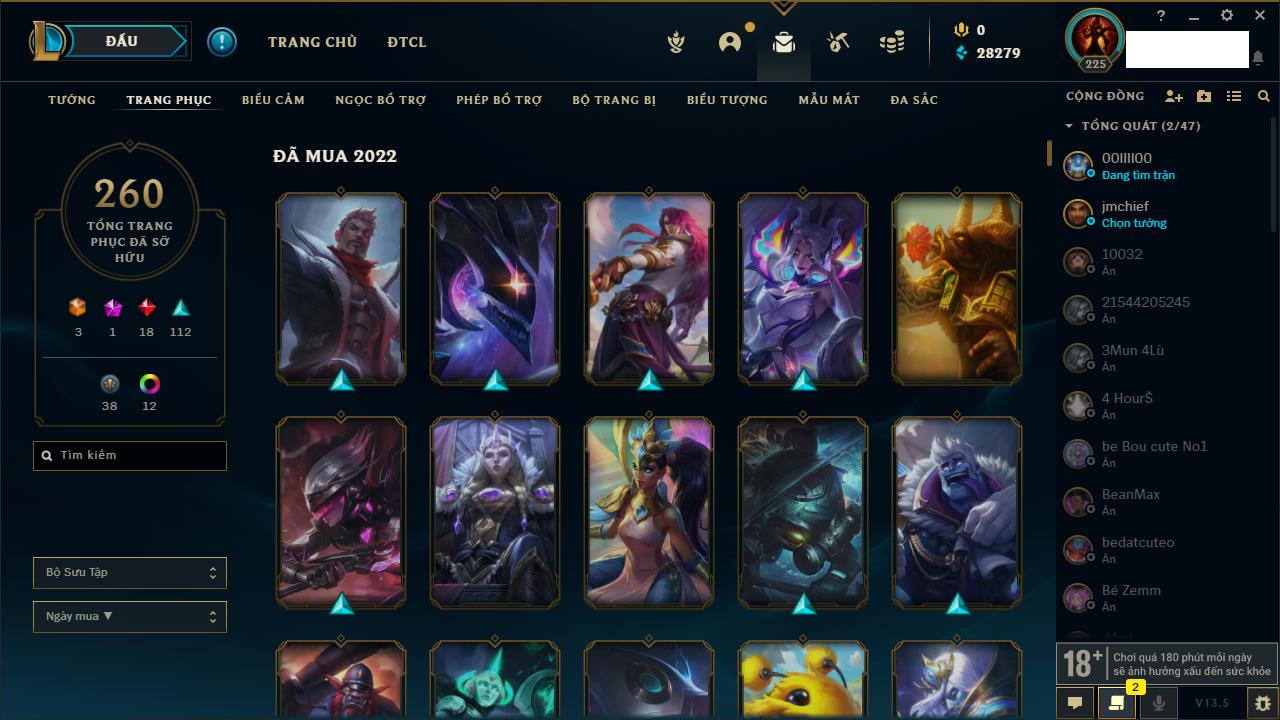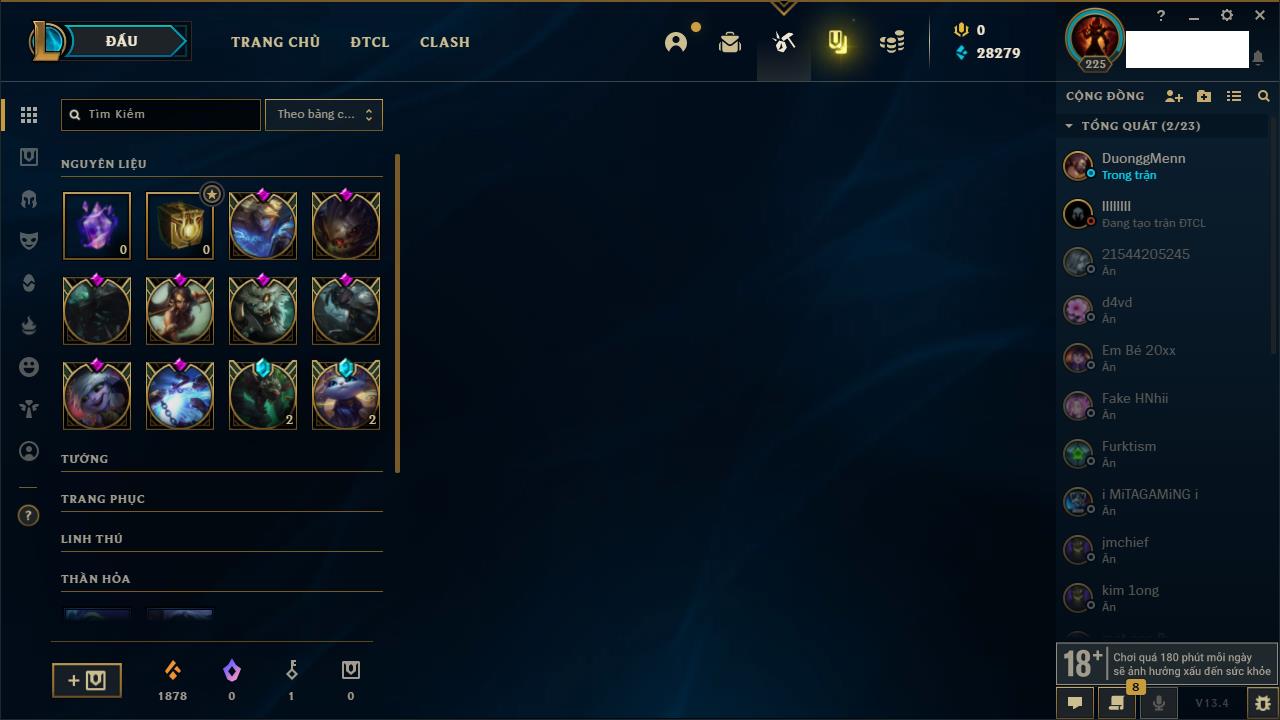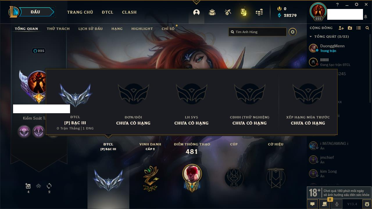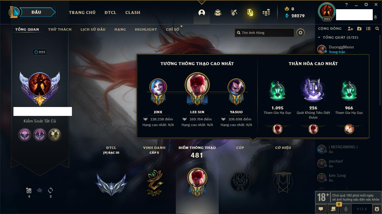 Rank Đơn: Vàng IIKhung: Bạch kimTướng: 172 - Còn 123420 THXTrang Phục: 231Rank ĐTCL: Bạch Kim IVLinh Thú: 213