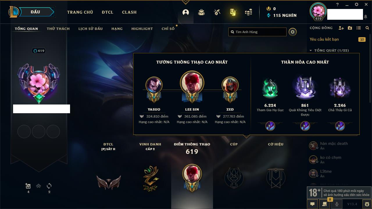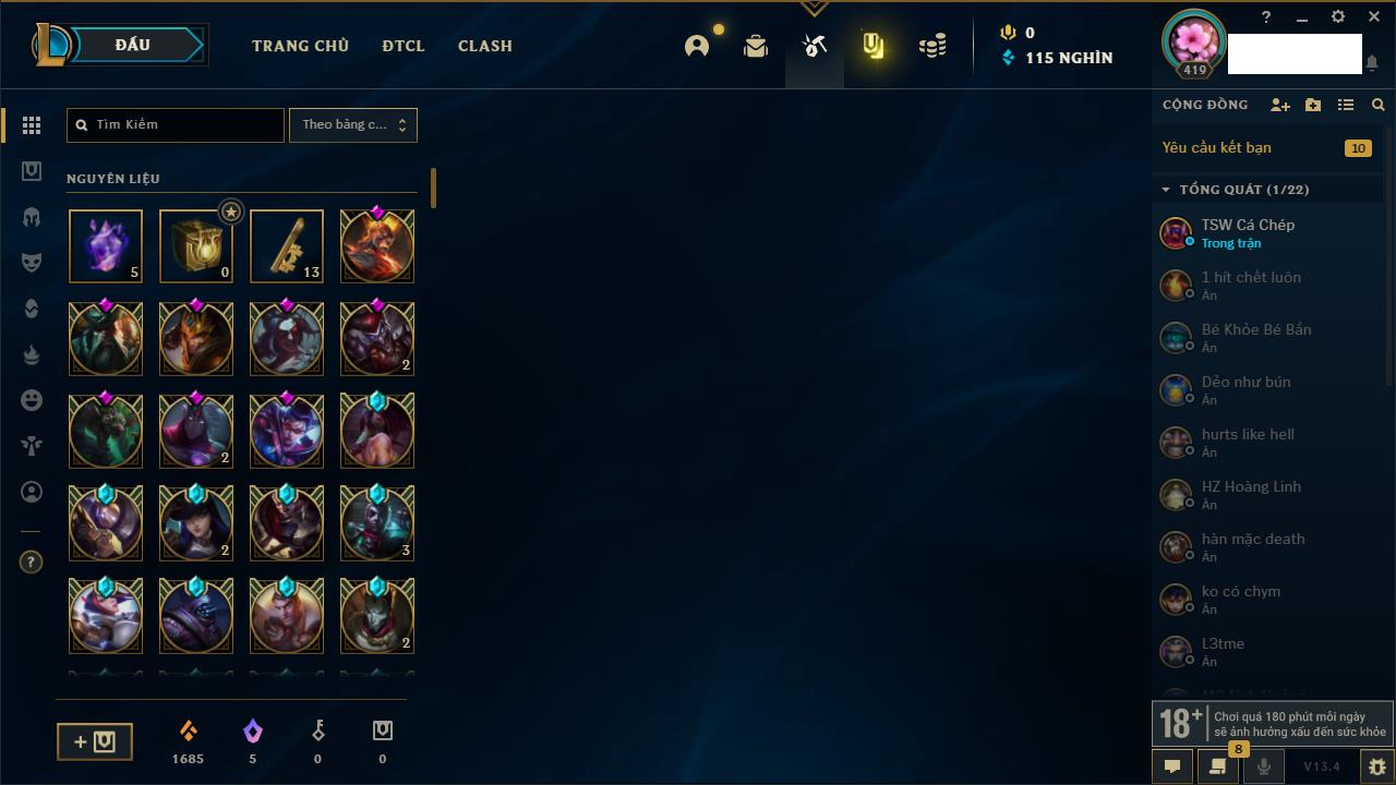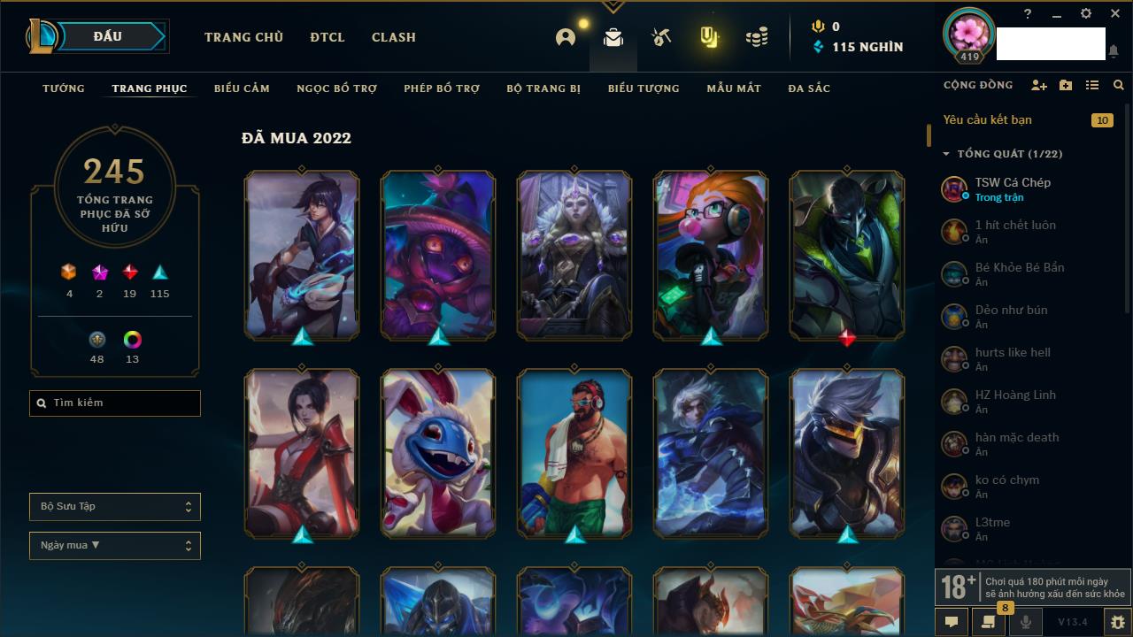 Rank Đơn: Vàng IIKhung: Bạch kimTướng: 172 - Còn 123420 THXTrang Phục: 231Rank ĐTCL: Bạch Kim IVLinh Thú: 213