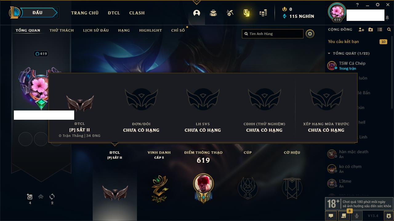 Rank Đơn: Đồng IIIKhung: ĐồngTướng: 171 - Còn 150319 THXTrang Phục: 245Rank ĐTCL: Chưa RankLinh Thú: 34