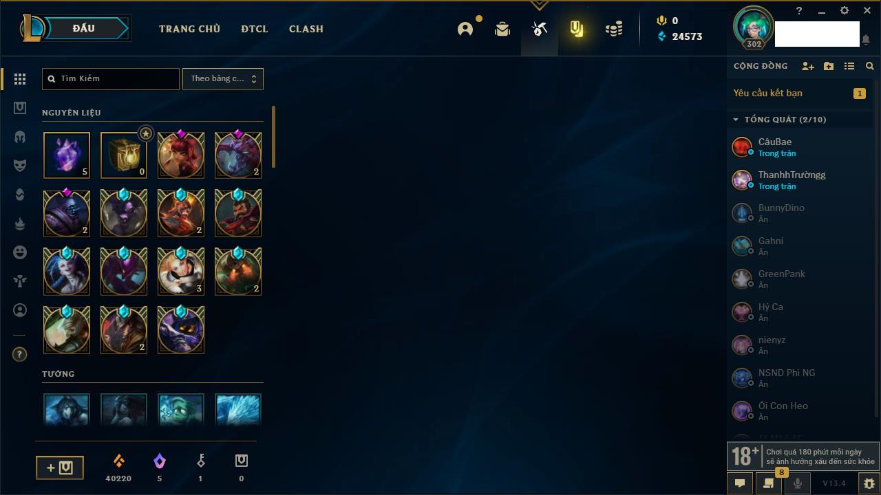 Rank Đơn: Vàng IVKhung: BạcTướng: 171 - Còn 231097 THXTrang Phục: 180Rank ĐTCL: Vàng IVLinh Thú: 110