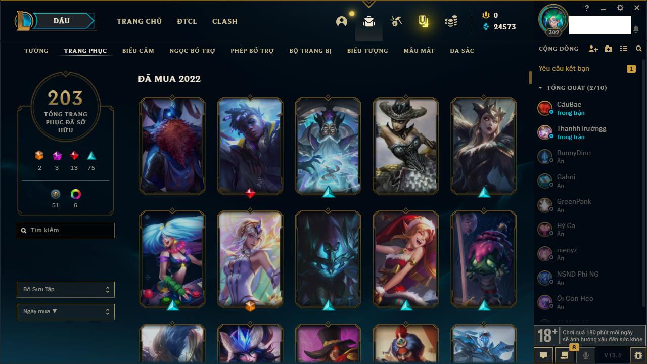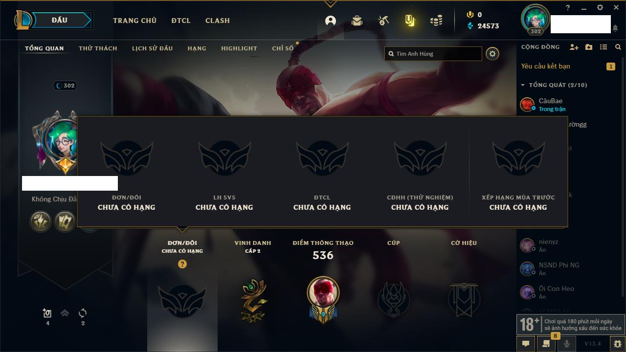 Rank Đơn: Vàng IVKhung: VàngTướng: 171 - Còn 48721 THXTrang Phục: 171Rank ĐTCL: Chưa RankLinh Thú: 27