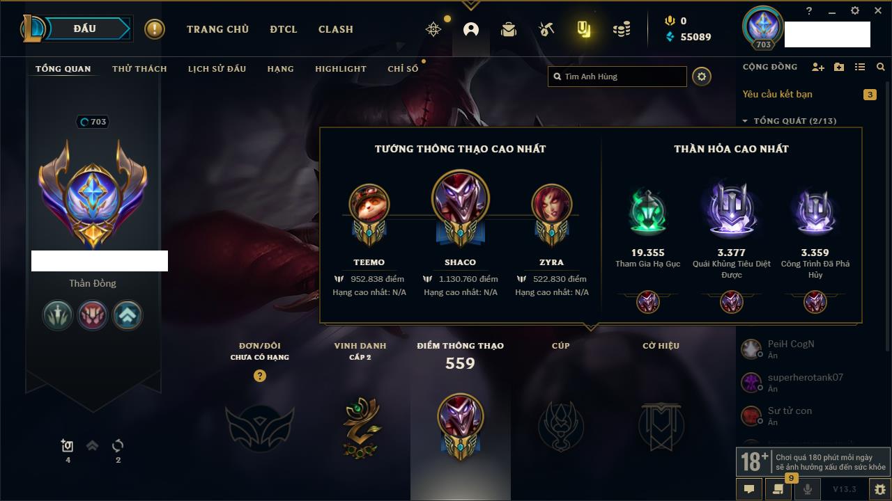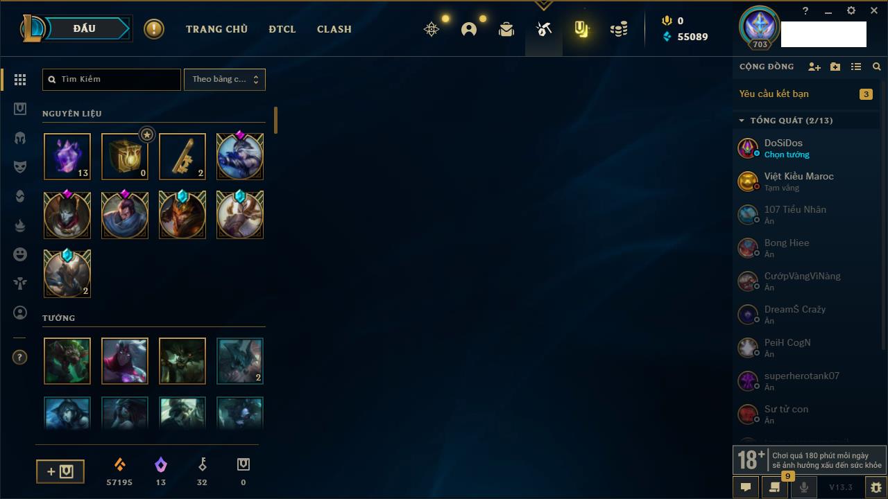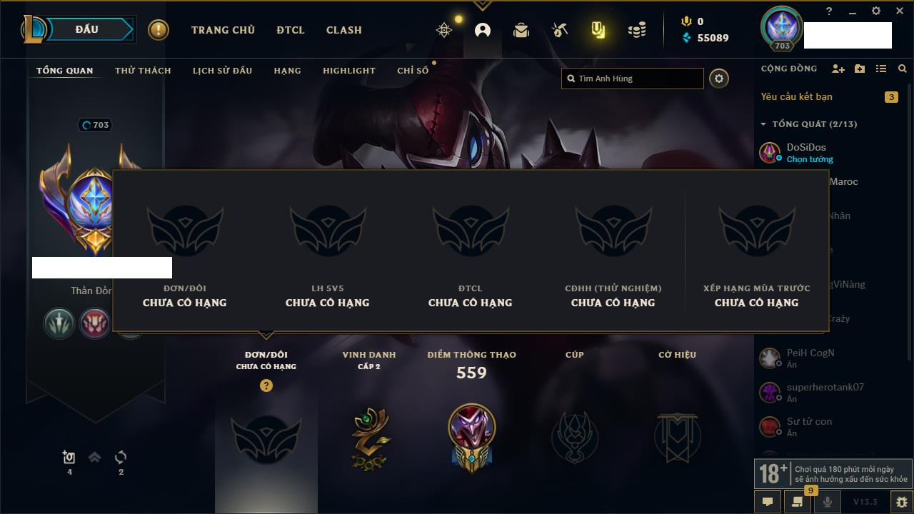Rank Đơn: Bạch Kim IVKhung: Bạch kimTướng: 171 - Còn 182788 THXTrang Phục: 158Rank ĐTCL: Lục Bảo IVLinh Thú: 56