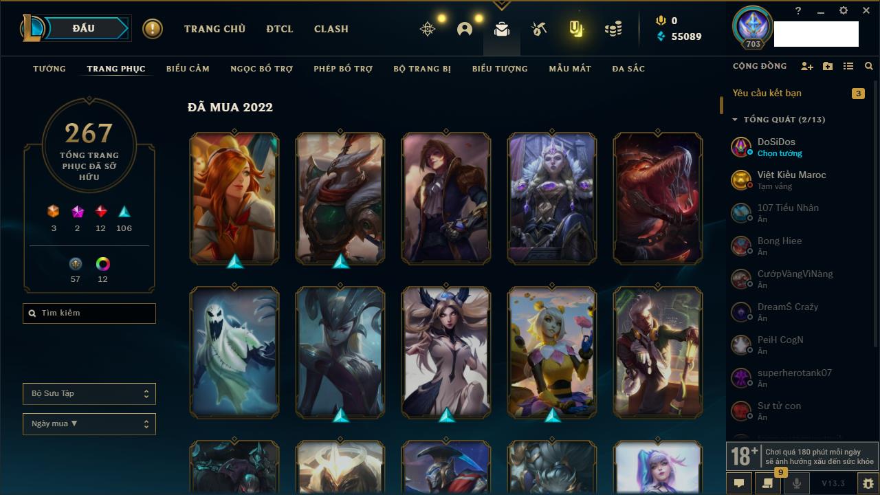 Rank Đơn: Bạch Kim IIKhung: Bạch kimTướng: 171 - Còn 263986 THXTrang Phục: 306Rank ĐTCL: Lục Bảo IVLinh Thú: 96