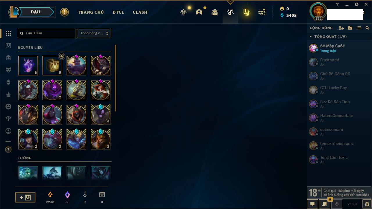 Rank Đơn: Bạch Kim IIKhung: Bạch kimTướng: 171 - Còn 315217 THXTrang Phục: 238Rank ĐTCL: Bạch Kim ILinh Thú: 116