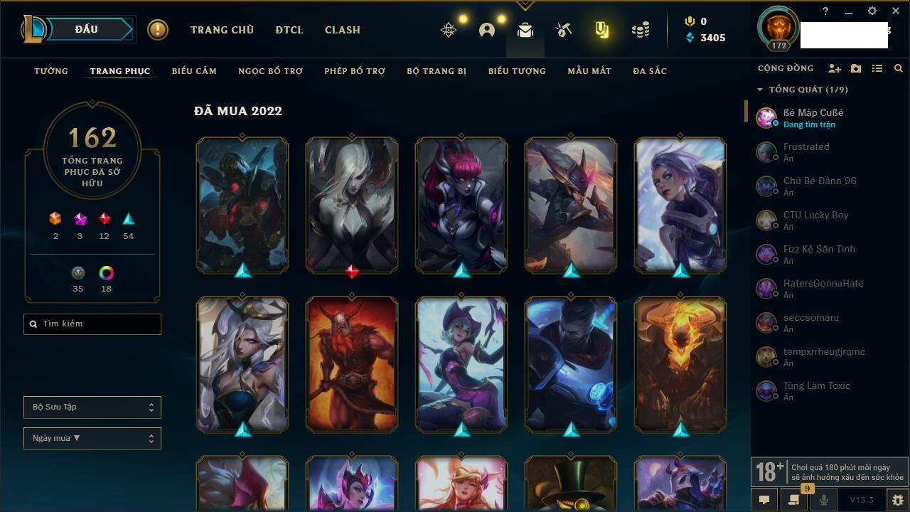 Rank Đơn: Bạch Kim IIKhung: Bạch kimTướng: 171 - Còn 316137 THXTrang Phục: 89Rank ĐTCL: Bạch Kim IIILinh Thú: 94