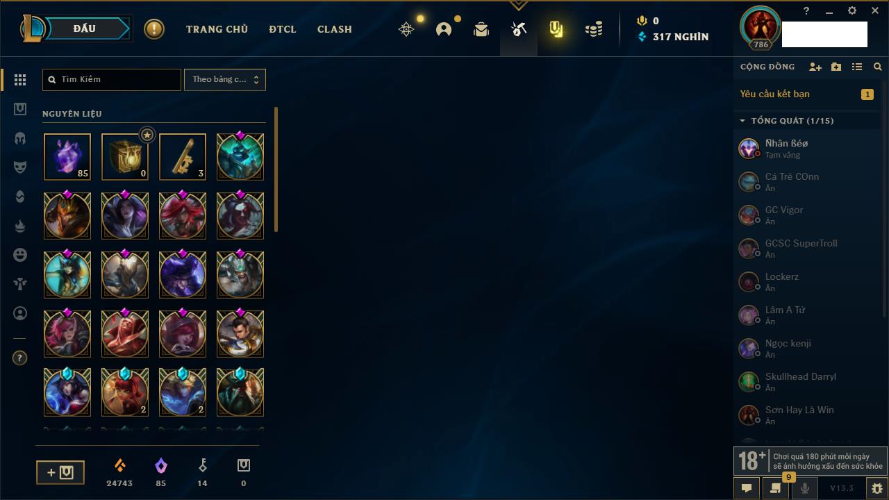 Rank Đơn: Vàng IKhung: Bạch kimTướng: 170 - Còn 212450 THXTrang Phục: 214Rank ĐTCL: Bạch Kim IVLinh Thú: 221