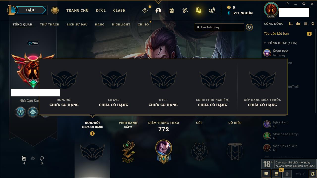 Rank Đơn: Bạch Kim IIKhung: Bạch kimTướng: 171 - Còn 263986 THXTrang Phục: 306Rank ĐTCL: Lục Bảo IVLinh Thú: 96