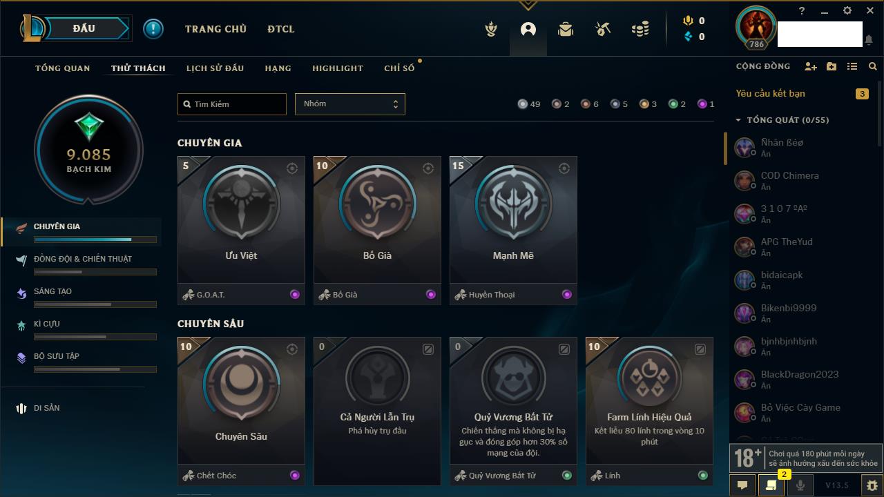 Rank Đơn: Bạch Kim IVKhung: Bạch kimTướng: 171 - Còn 182788 THXTrang Phục: 158Rank ĐTCL: Lục Bảo IVLinh Thú: 56