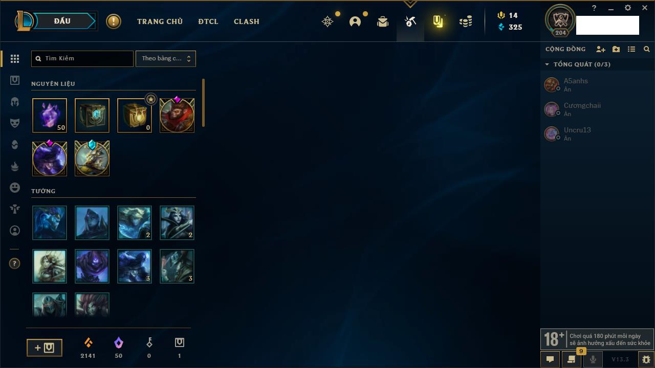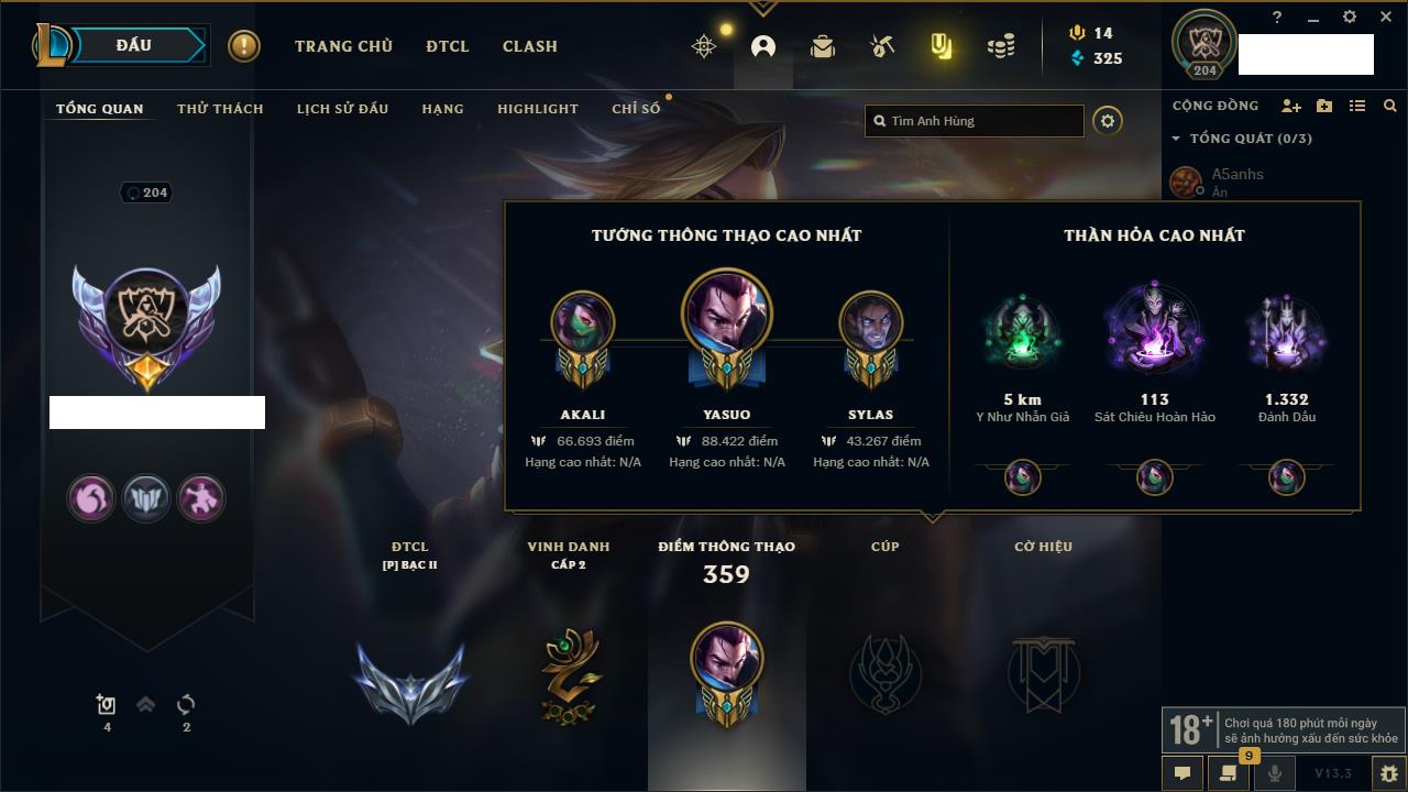 Rank Đơn: Chưa rank mùa nàoKhung: Chưa có khungTướng: 0 - Còn 2000 THXTrang Phục: 0Rank ĐTCL: Chưa RankLinh Thú: 14
