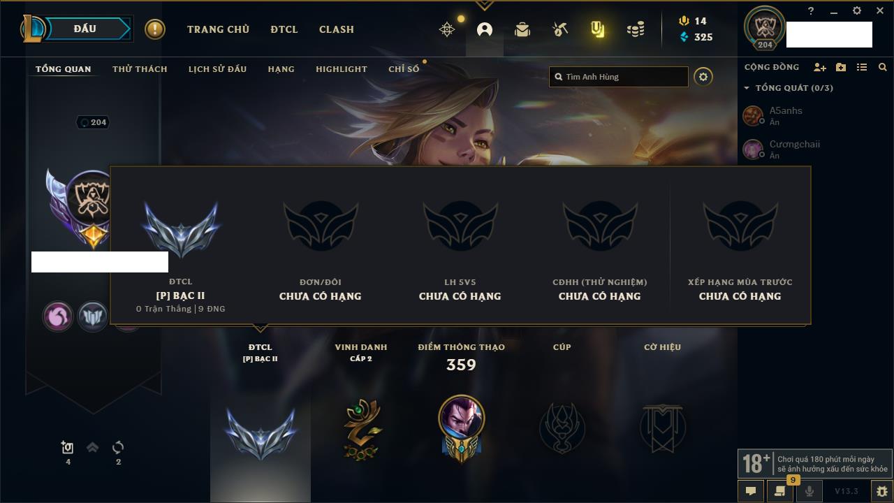 Rank Đơn: Chưa RankKhung: BạcTướng: 141 - Còn 299 THXTrang Phục: 101Rank ĐTCL: Chưa RankLinh Thú: 84