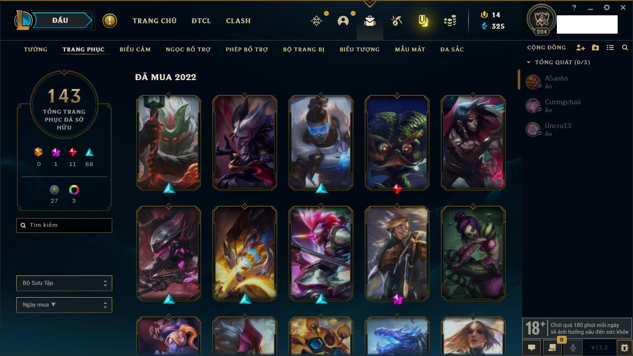 Rank Đơn: Chưa RankKhung: Chưa có khungTướng: 154 - Còn 18477 THXTrang Phục: 127Rank ĐTCL: Vàng ILinh Thú: 183