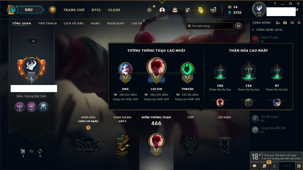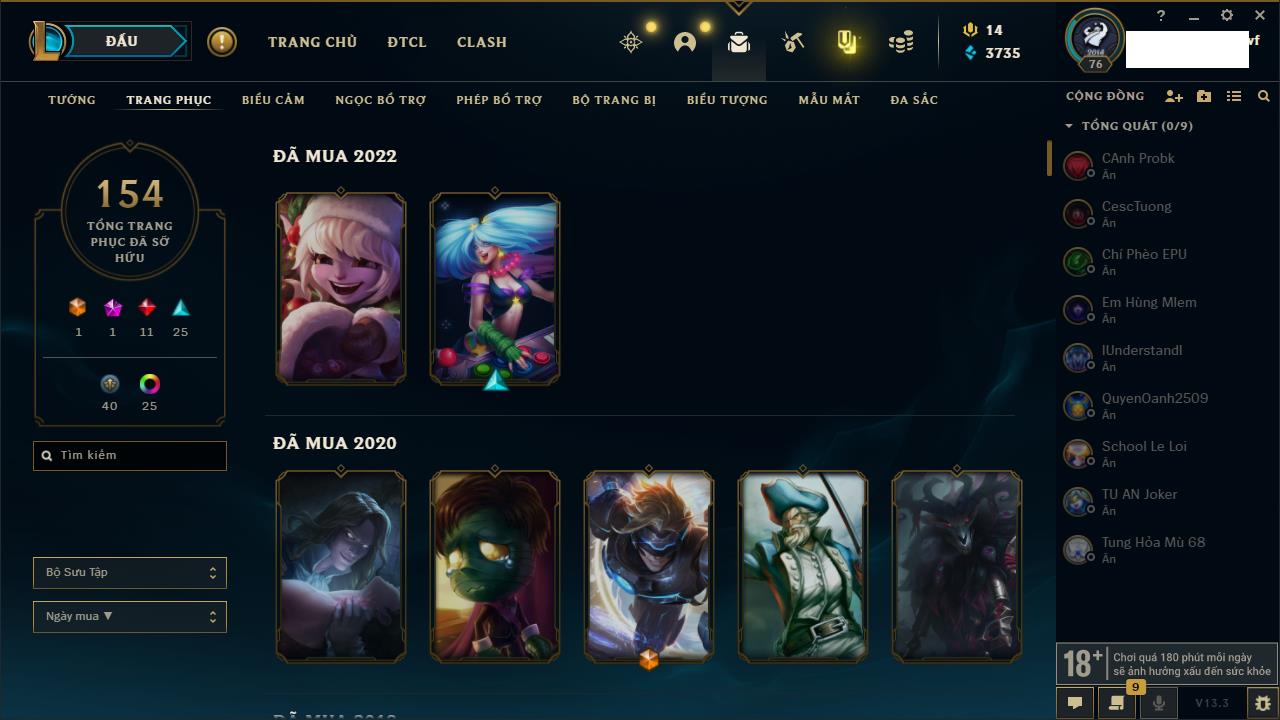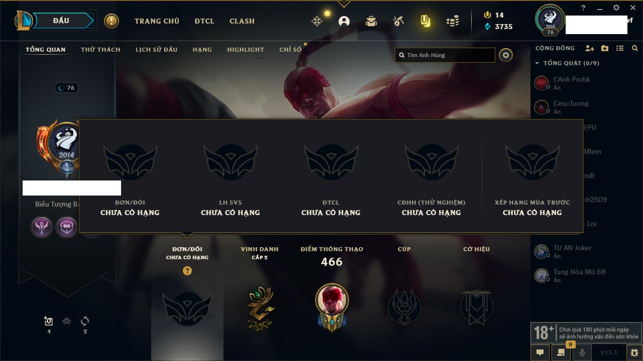 Rank Đơn: Chưa RankKhung: Chưa có khungTướng: 154 - Còn 18477 THXTrang Phục: 127Rank ĐTCL: Vàng ILinh Thú: 183