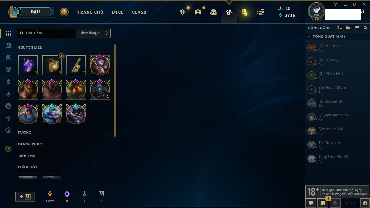 Rank Đơn: Chưa rank mùa nàoKhung: Chưa có khungTướng: 0 - Còn 2000 THXTrang Phục: 0Rank ĐTCL: Chưa RankLinh Thú: 14