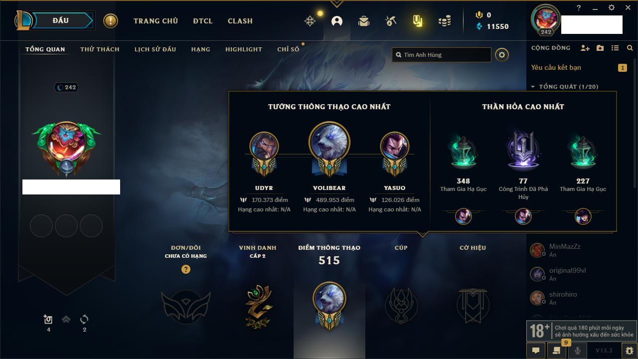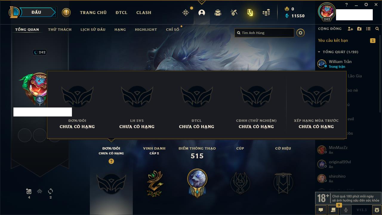 Rank Đơn: Chưa RankKhung: BạcTướng: 141 - Còn 299 THXTrang Phục: 101Rank ĐTCL: Chưa RankLinh Thú: 84