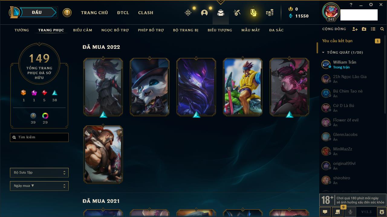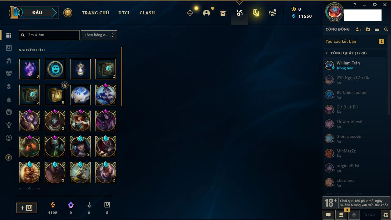 Rank Đơn: Chưa RankKhung: Chưa có khungTướng: 162 - Còn 23234 THXTrang Phục: 150Rank ĐTCL: Chưa RankLinh Thú: 42