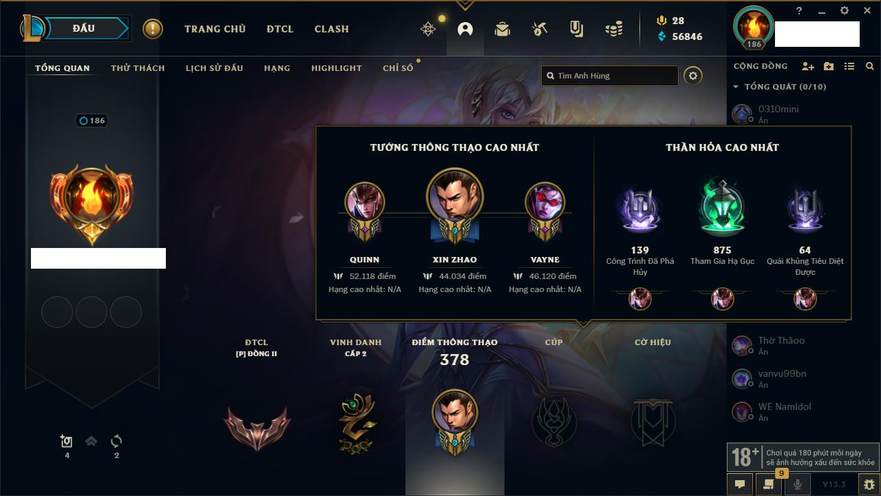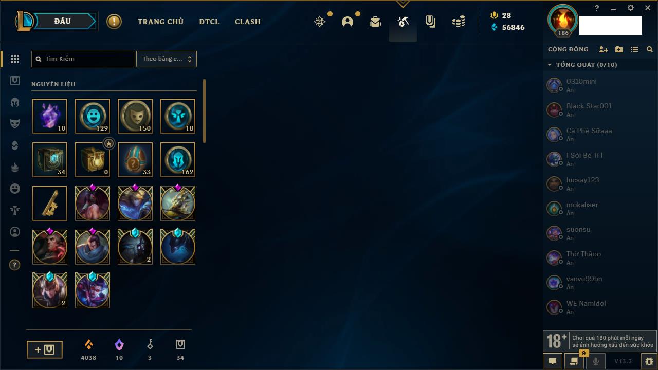 Rank Đơn: Bạc IVKhung: VàngTướng: 172 - Còn 358384 THXTrang Phục: 177Rank ĐTCL: Lục Bảo IILinh Thú: 211