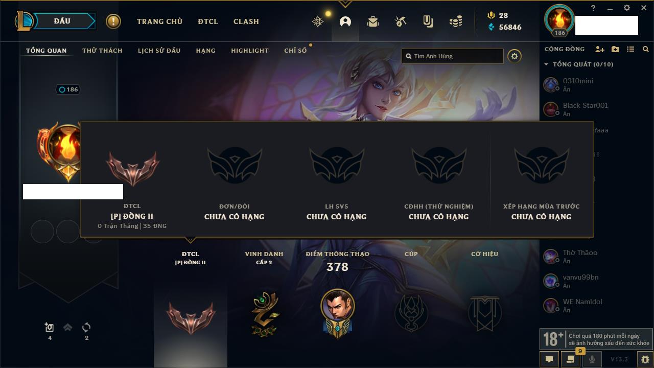 Rank Đơn: Sắt IKhung: SắtTướng: 171 - Còn 125789 THXTrang Phục: 151Rank ĐTCL: Đồng IIILinh Thú: 72