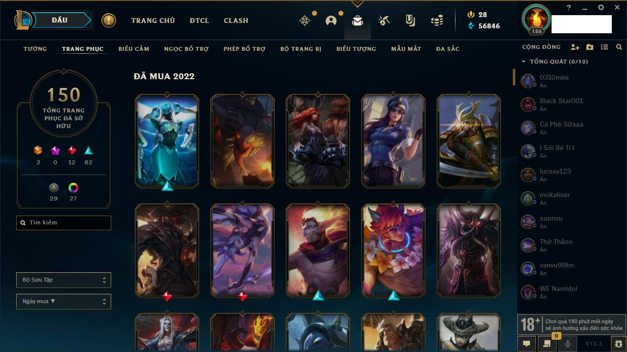 Rank Đơn: Vàng IVKhung: BạcTướng: 171 - Còn 426239 THXTrang Phục: 162Rank ĐTCL: Chưa RankLinh Thú: 33