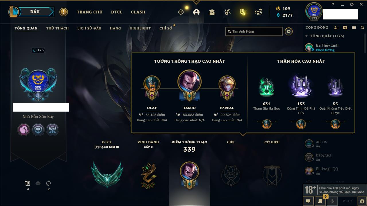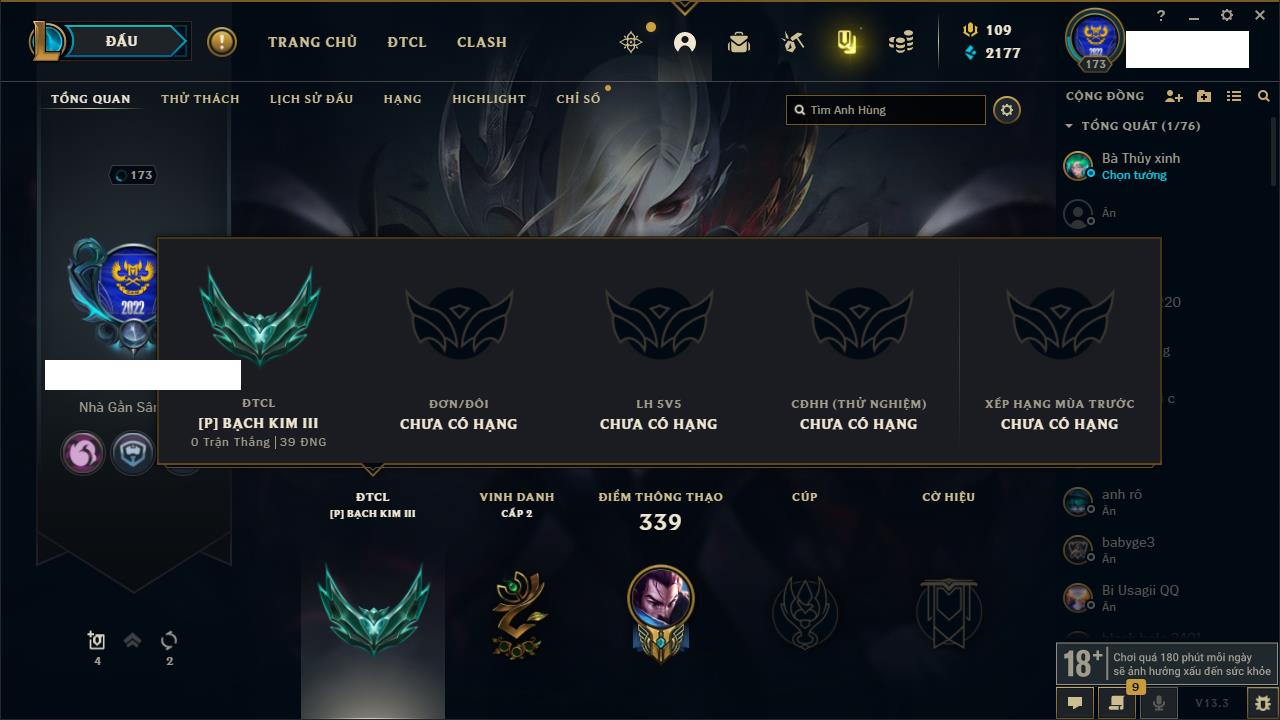 Rank Đơn: Chưa RankKhung: BạcTướng: 141 - Còn 299 THXTrang Phục: 101Rank ĐTCL: Chưa RankLinh Thú: 84