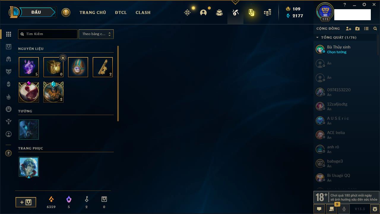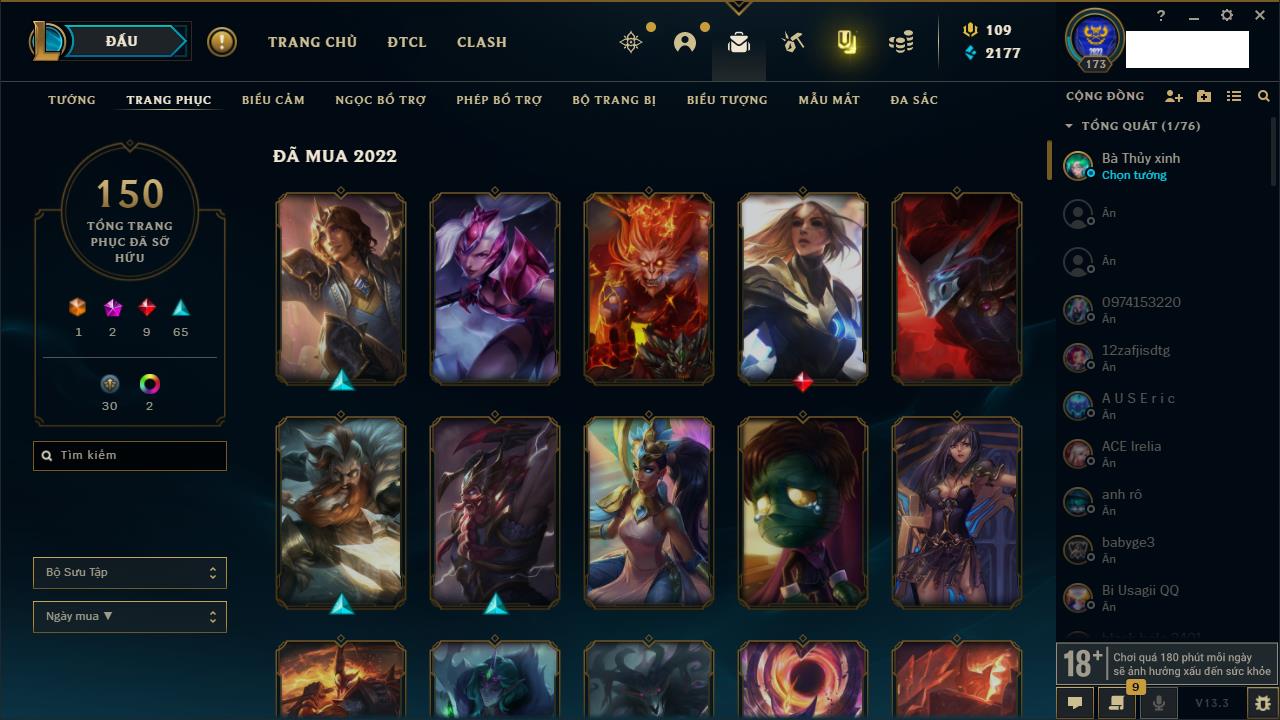 Rank Đơn: Chưa RankKhung: Chưa có khungTướng: 162 - Còn 23234 THXTrang Phục: 150Rank ĐTCL: Chưa RankLinh Thú: 42
