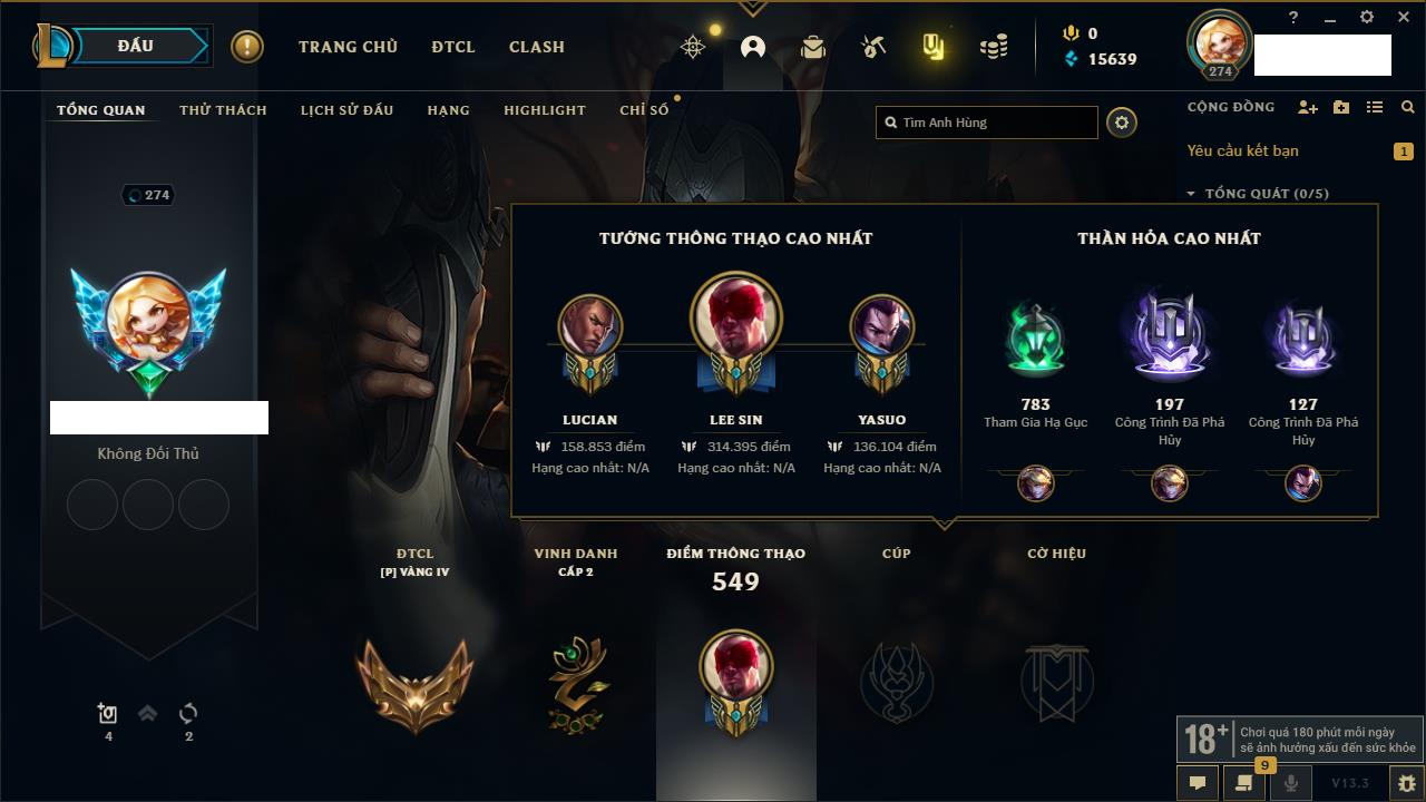 Rank Đơn: Chưa rank mùa nàoKhung: Chưa có khungTướng: 0 - Còn 2000 THXTrang Phục: 0Rank ĐTCL: Chưa RankLinh Thú: 14