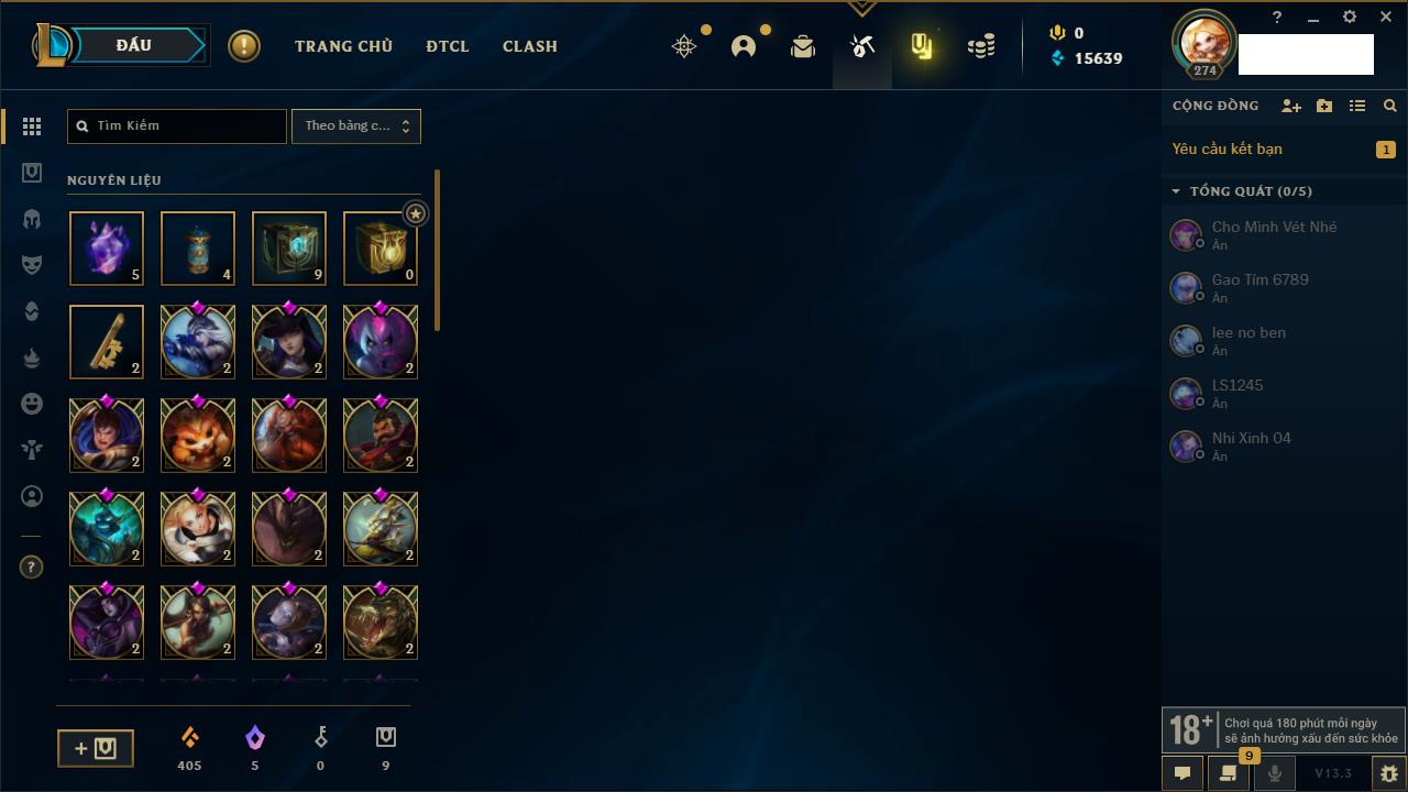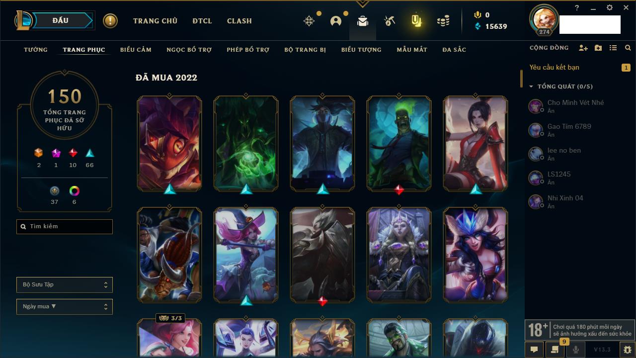 Rank Đơn: Chưa RankKhung: Chưa có khungTướng: 162 - Còn 23234 THXTrang Phục: 150Rank ĐTCL: Chưa RankLinh Thú: 42