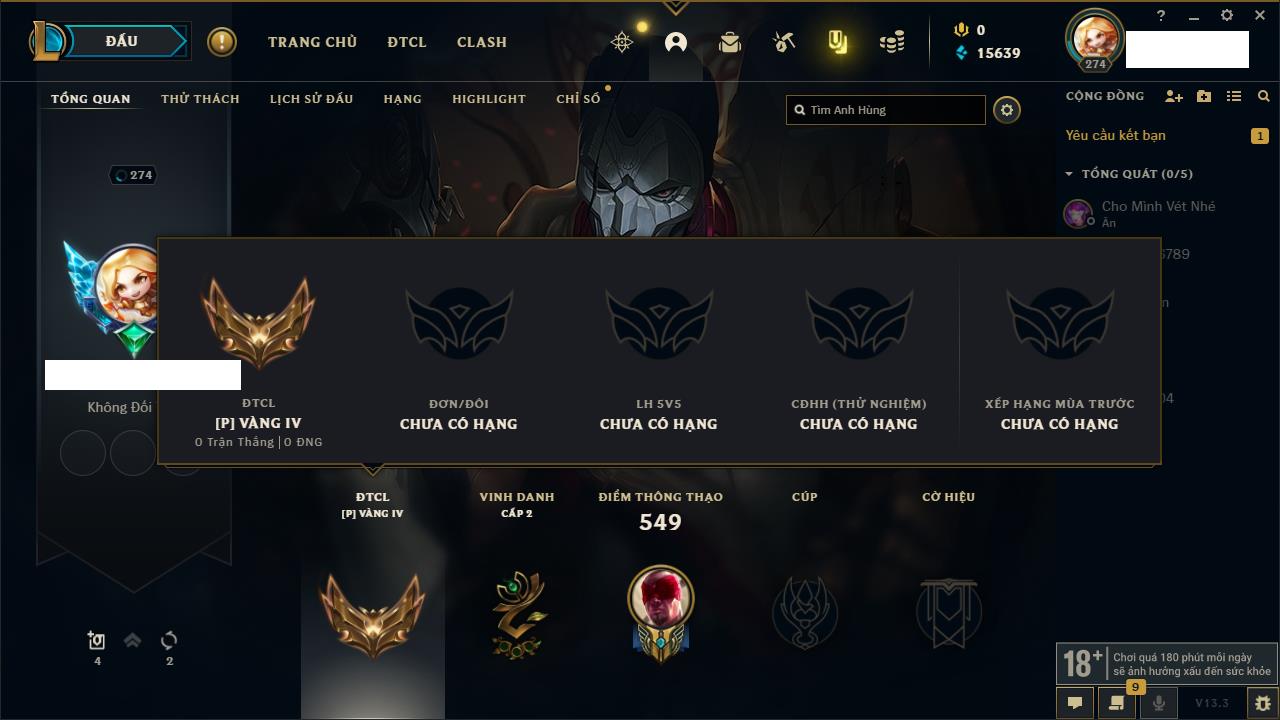 Rank Đơn: Chưa RankKhung: Chưa có khungTướng: 154 - Còn 18477 THXTrang Phục: 127Rank ĐTCL: Vàng ILinh Thú: 183