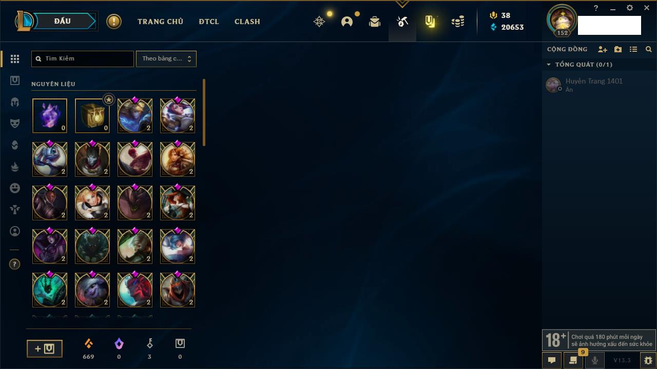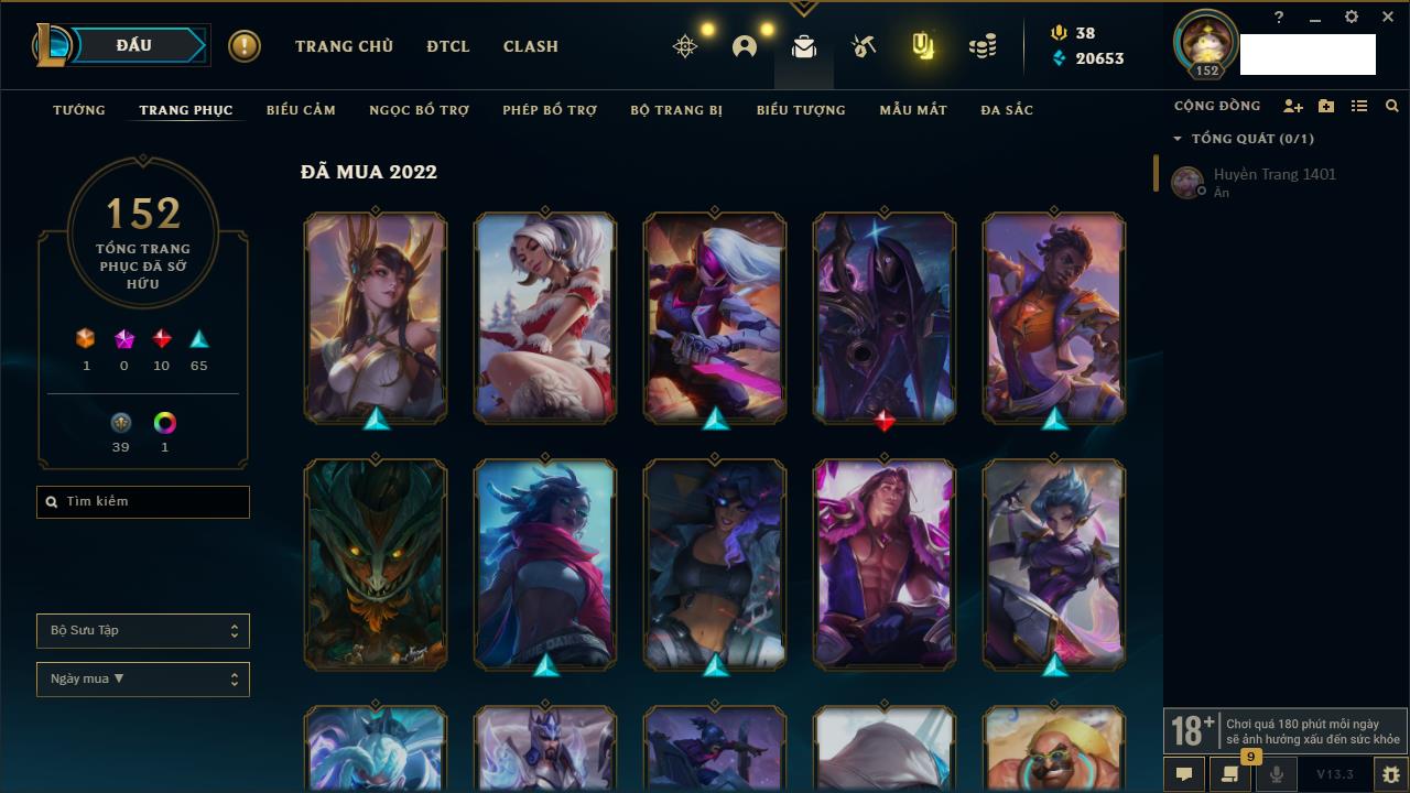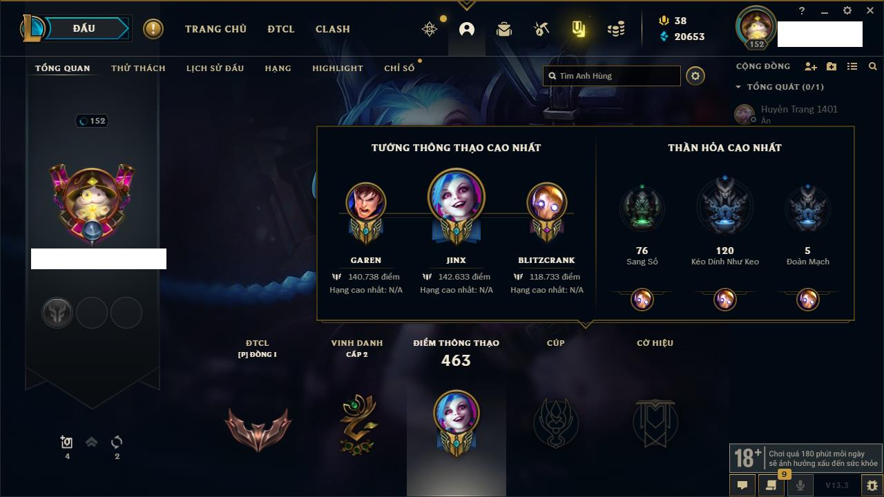Rank Đơn: Đồng IIKhung: Chưa có khungTướng: 170 - Còn 56487 THXTrang Phục: 90Rank ĐTCL: Chưa RankLinh Thú: 129