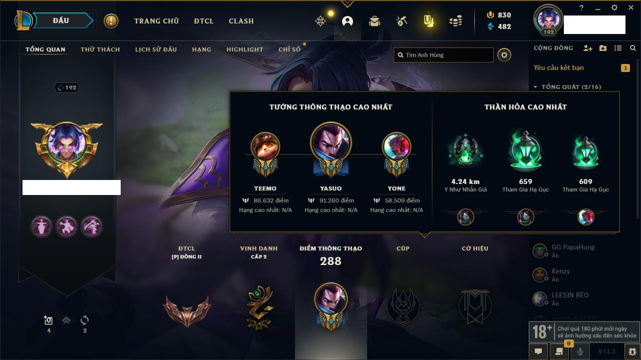 Rank Đơn: Đồng IIKhung: ĐồngTướng: 170 - Còn 66145 THXTrang Phục: 215Rank ĐTCL: Chưa RankLinh Thú: 52