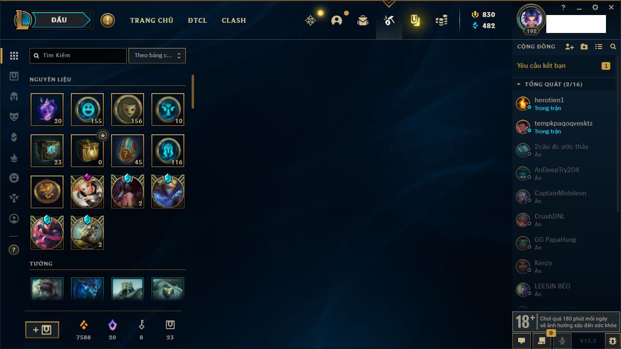 Rank Đơn: Vàng IIIKhung: BạcTướng: 171 - Còn 101359 THXTrang Phục: 88Rank ĐTCL: Kim Cương IVLinh Thú: 200
