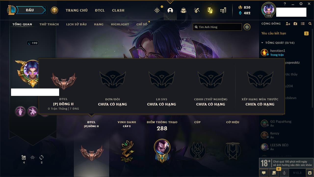 Rank Đơn: Đồng IIKhung: ĐồngTướng: 171 - Còn 532494 THXTrang Phục: 161Rank ĐTCL: Bạc IIILinh Thú: 98