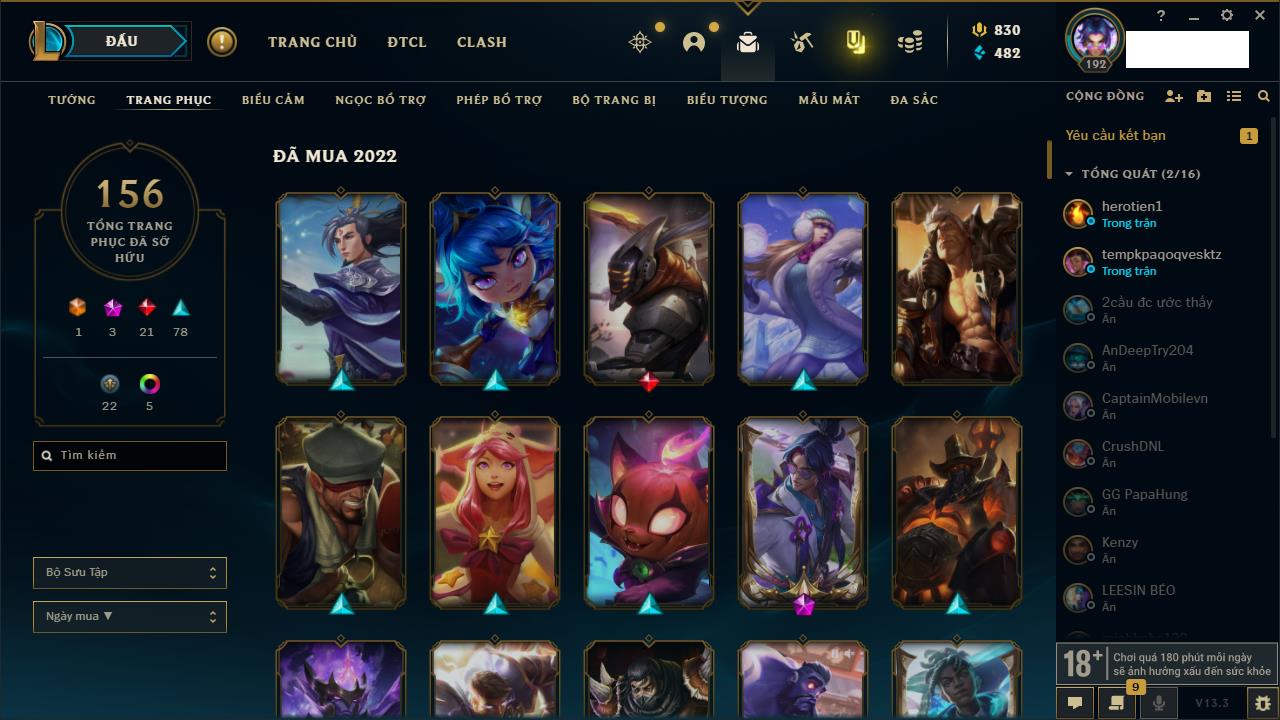 Rank Đơn: Đồng IKhung: ĐồngTướng: 168 - Còn 11447 THXTrang Phục: 245Rank ĐTCL: Chưa RankLinh Thú: 53