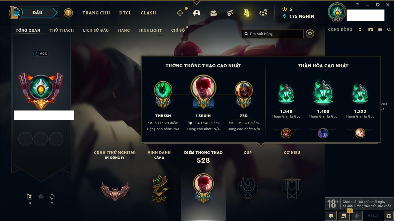 Rank Đơn: Chưa RankKhung: Chưa có khungTướng: 168 - Còn 10207 THXTrang Phục: 113Rank ĐTCL: Chưa RankLinh Thú: 103