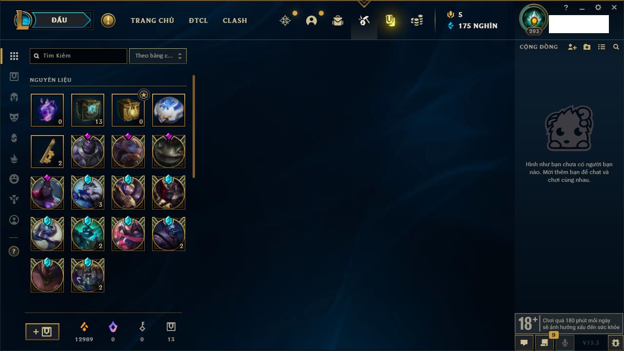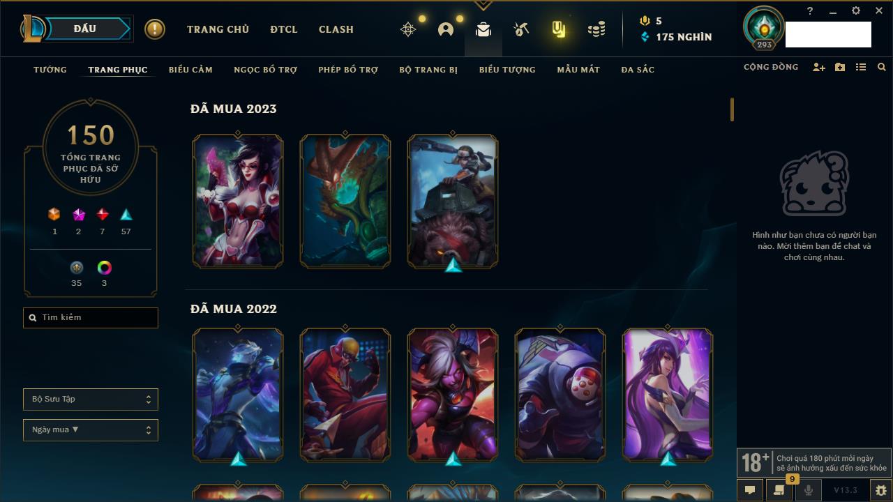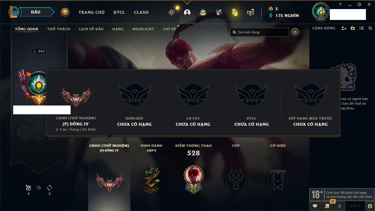 Rank Đơn: Chưa RankKhung: Chưa có khungTướng: 162 - Còn 23234 THXTrang Phục: 150Rank ĐTCL: Chưa RankLinh Thú: 42