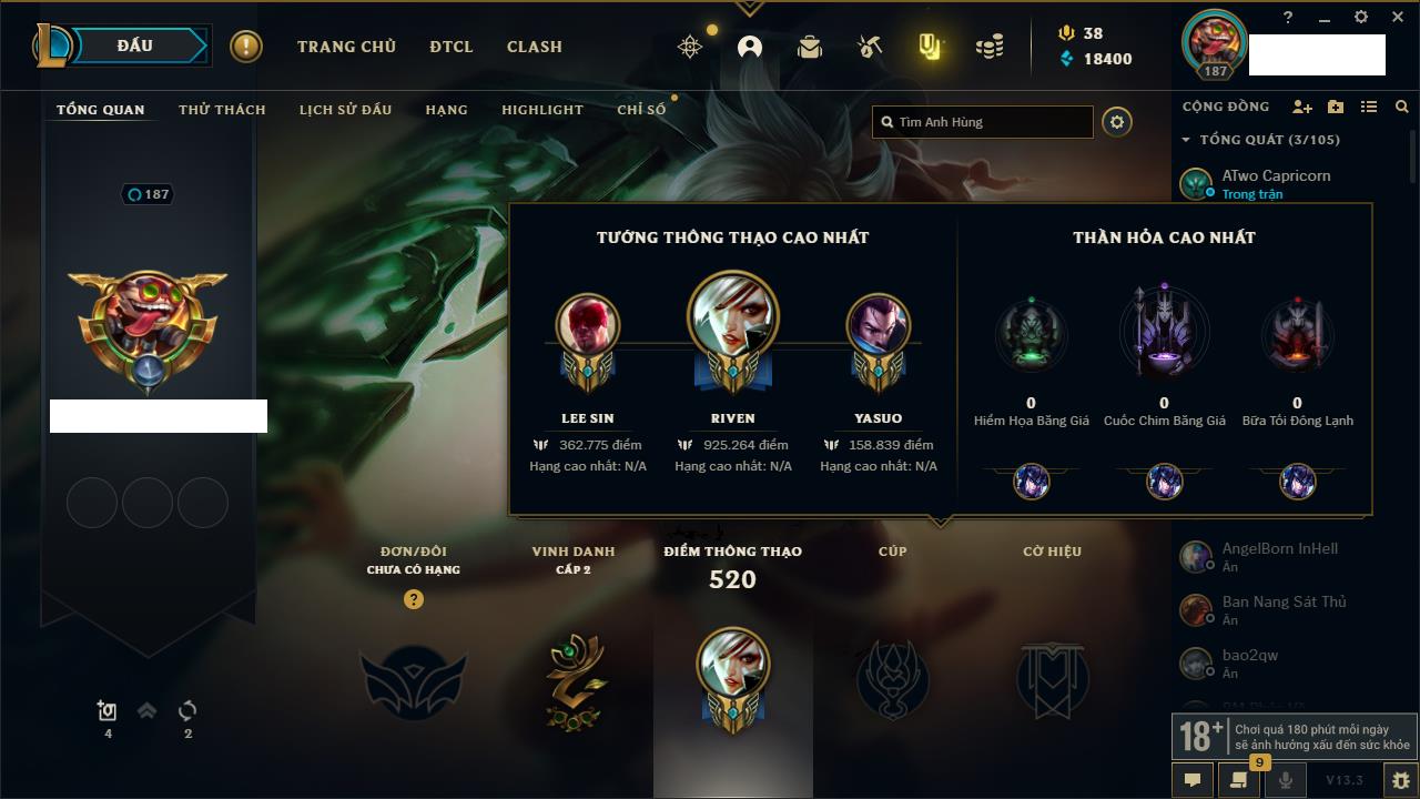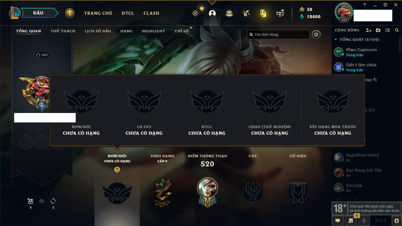 Rank Đơn: Đồng IIKhung: Chưa có khungTướng: 170 - Còn 56487 THXTrang Phục: 90Rank ĐTCL: Chưa RankLinh Thú: 129