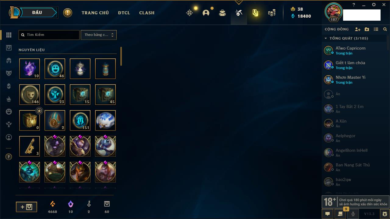 Rank Đơn: Vàng IVKhung: VàngTướng: 146 - Còn 89110 THXTrang Phục: 63Rank ĐTCL: Vàng IIILinh Thú: 41