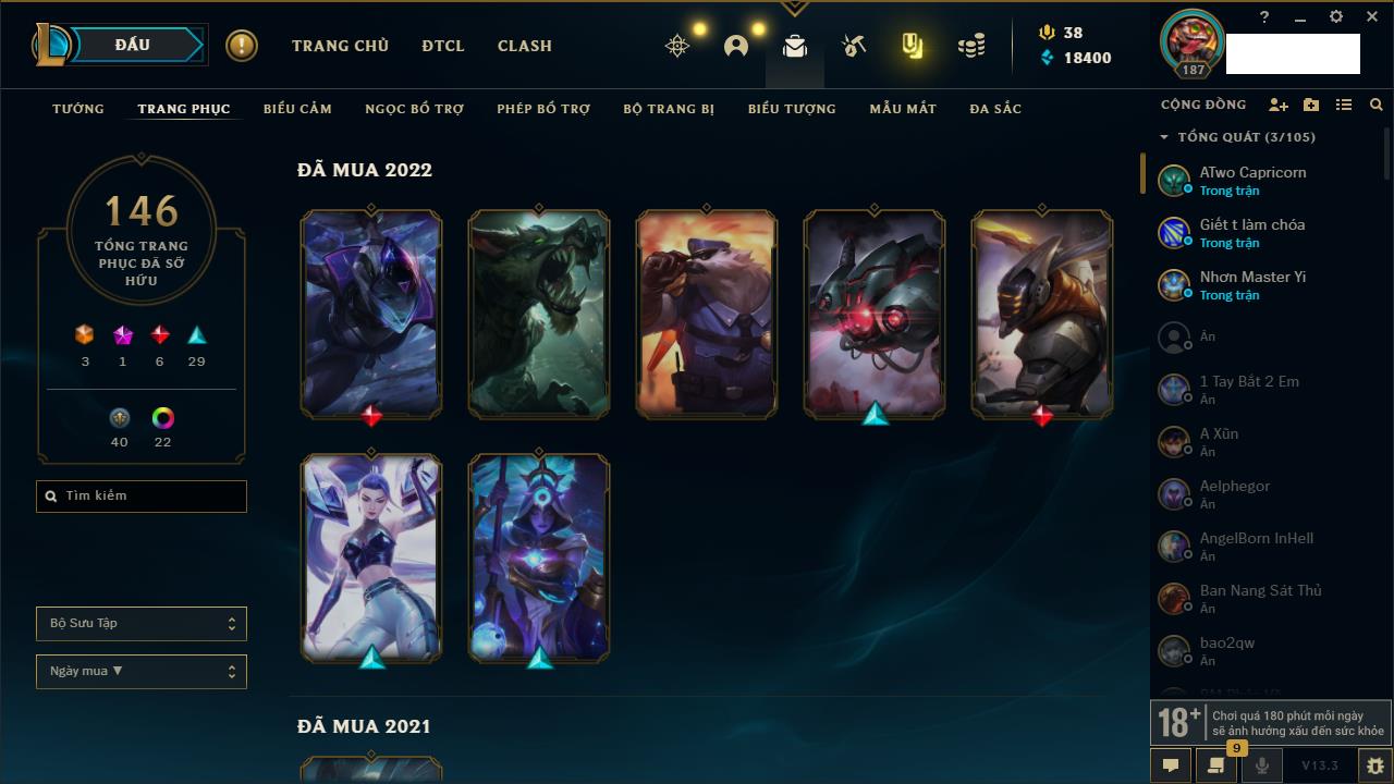Rank Đơn: Vàng IIIKhung: VàngTướng: 170 - Còn 33222 THXTrang Phục: 136Rank ĐTCL: Chưa RankLinh Thú: 40