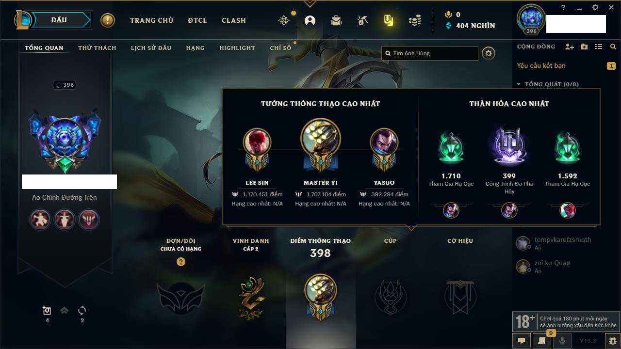 Rank Đơn: Bạc IIKhung: Chưa có khungTướng: 145 - Còn 12230 THXTrang Phục: 183Rank ĐTCL: Chưa RankLinh Thú: 71