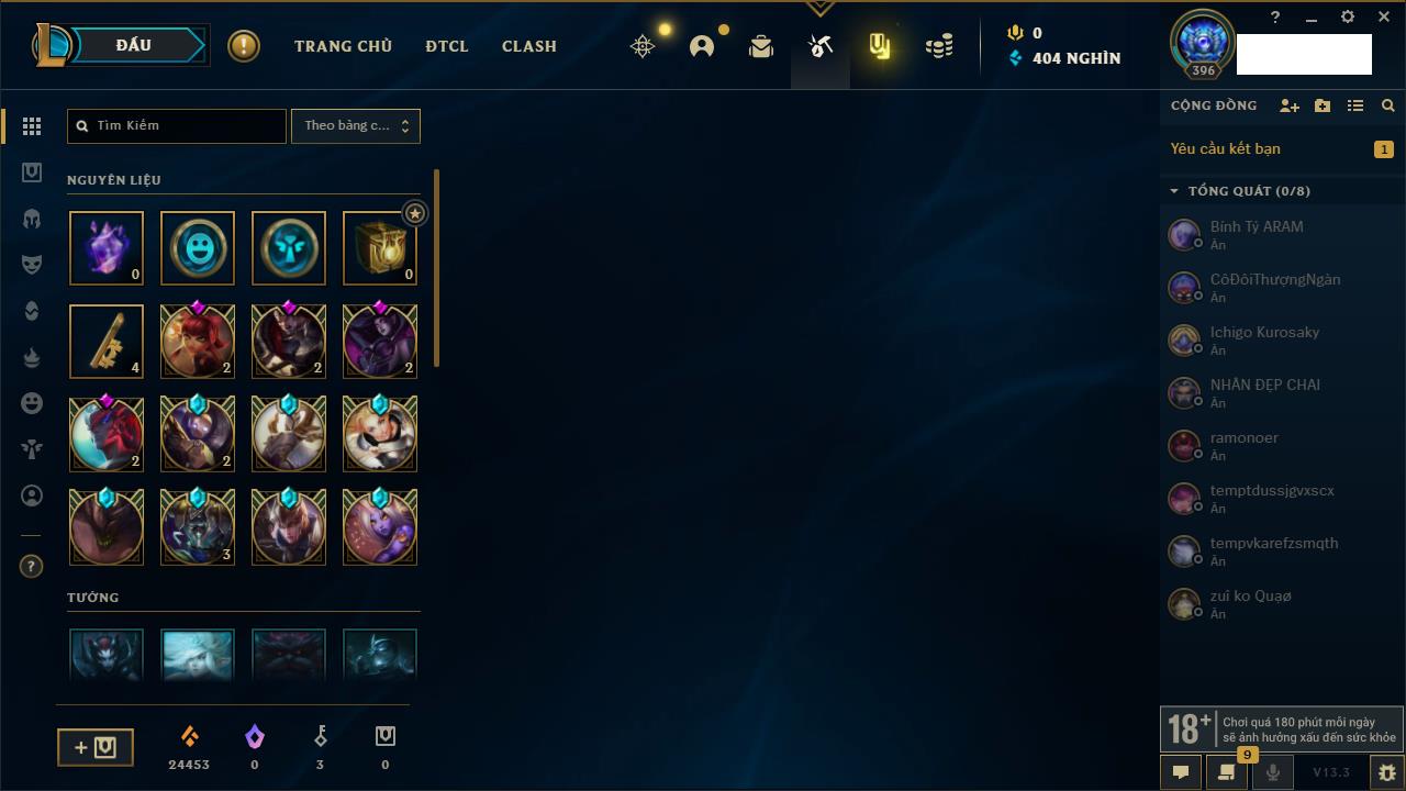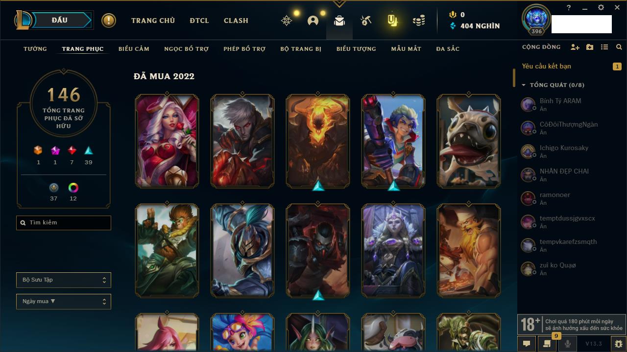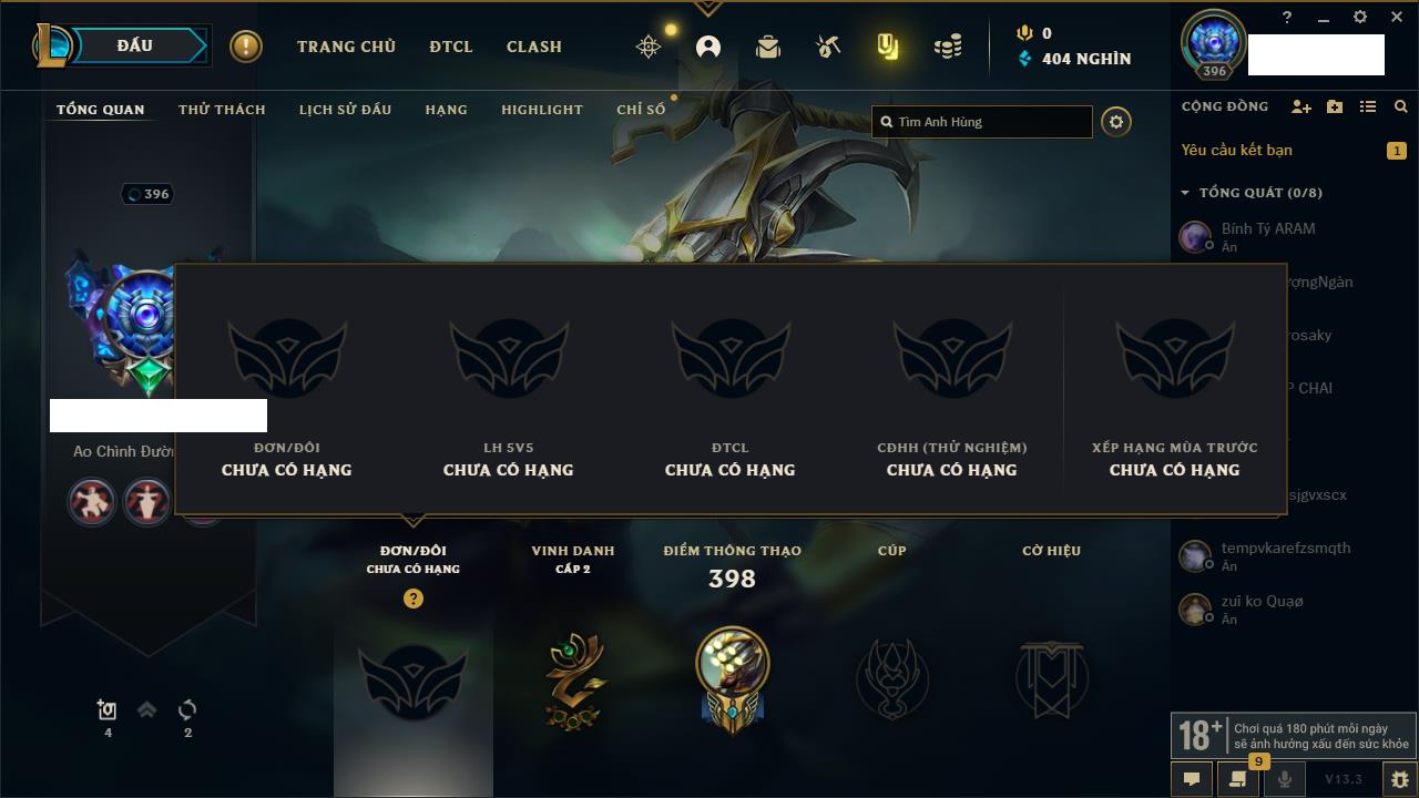 Rank Đơn: Chưa RankKhung: Chưa có khungTướng: 169 - Còn 43188 THXTrang Phục: 205Rank ĐTCL: Chưa RankLinh Thú: 259